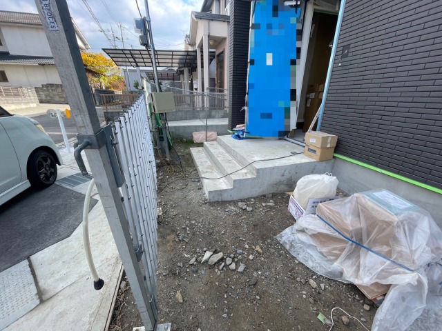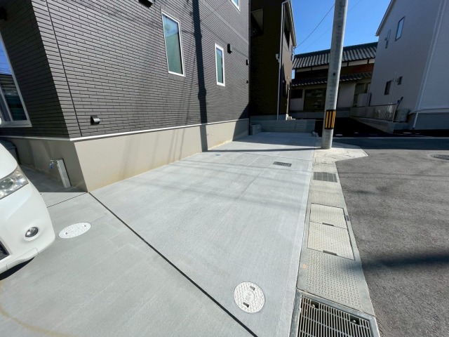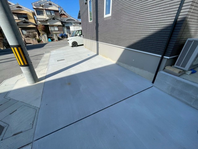 外周は防草シートと砕石敷き、とちの形状を最大限に活かしたコンクリート土間のオープン外構に、 シンプルに使いやすさバツグンに仕上がりました。