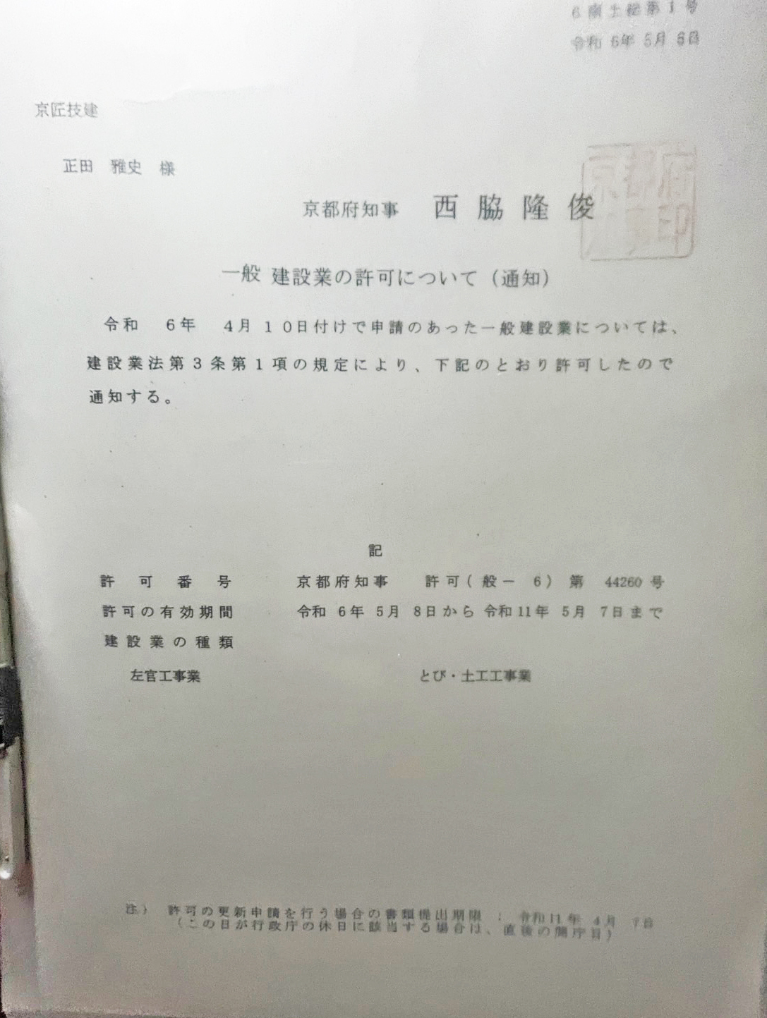 | 建設業許可番号 | 京都府知事(般-6)第44260号 |