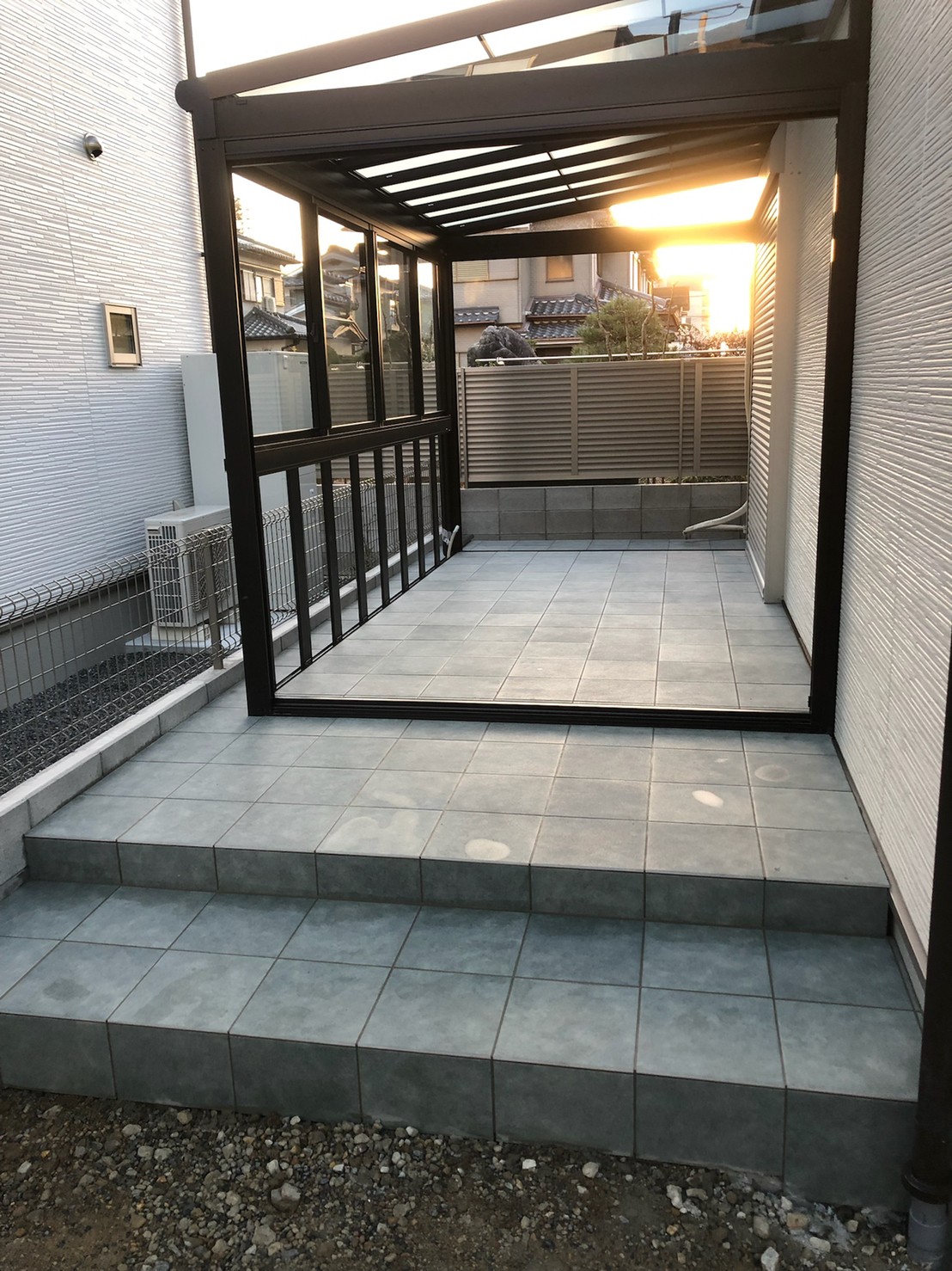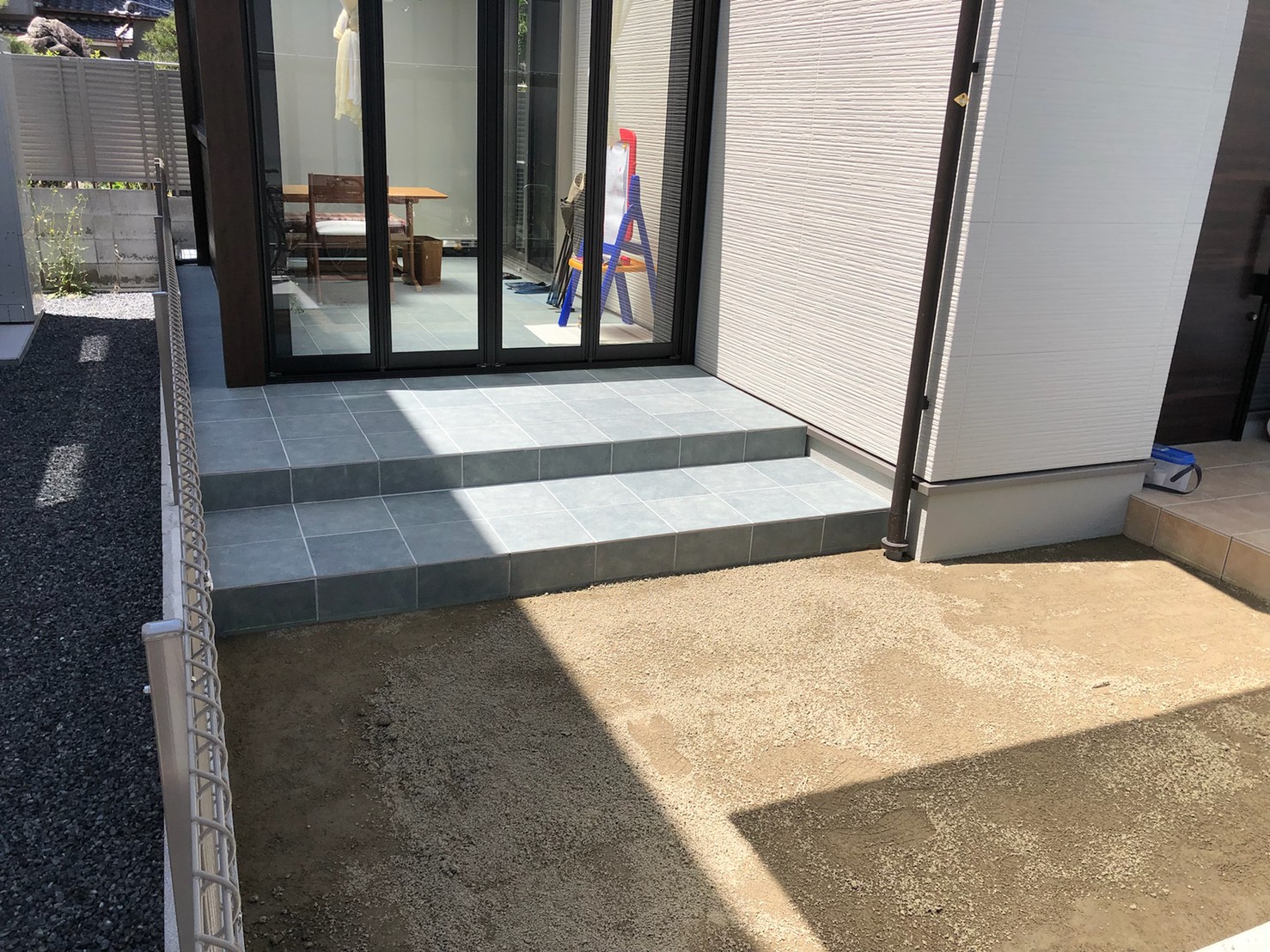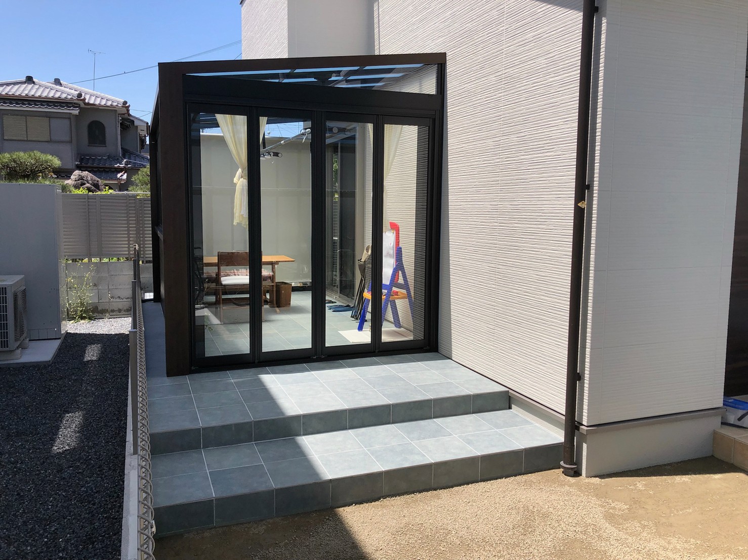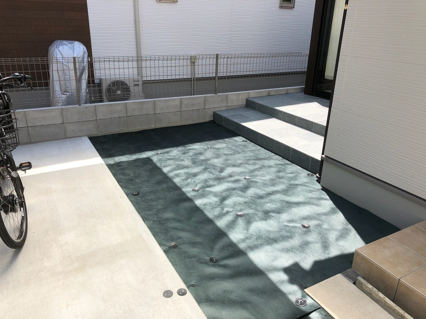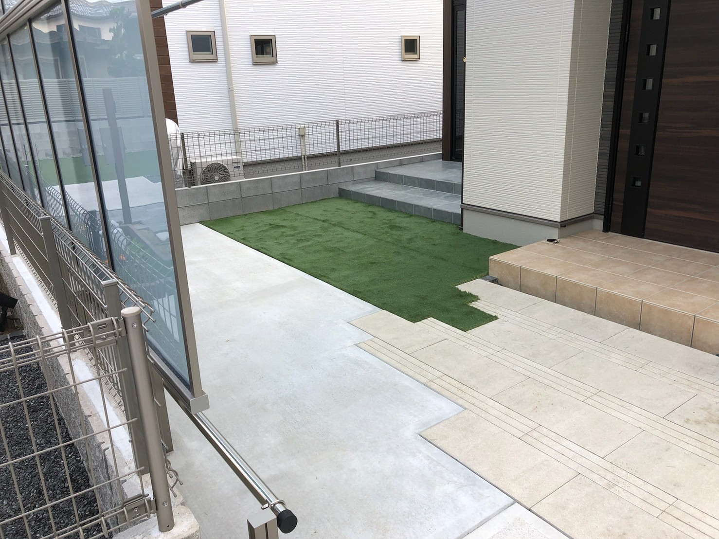 お子様が素足でも行き来できるようにと、サンルーム~タイルデッキ~人工芝の動線を確保させて頂きました。 駐輪場の側面パネルも2段で横雨にも負けない使い勝手のよいスペースに仕上がりました。