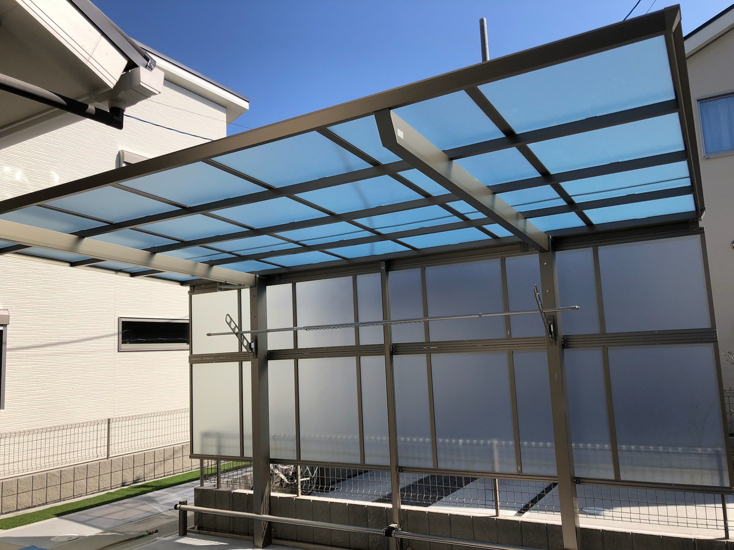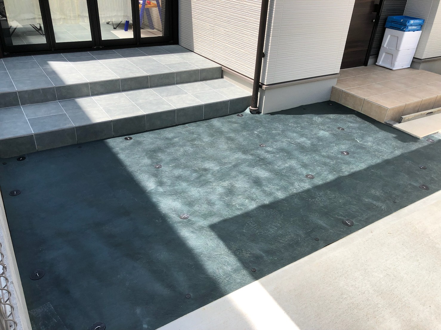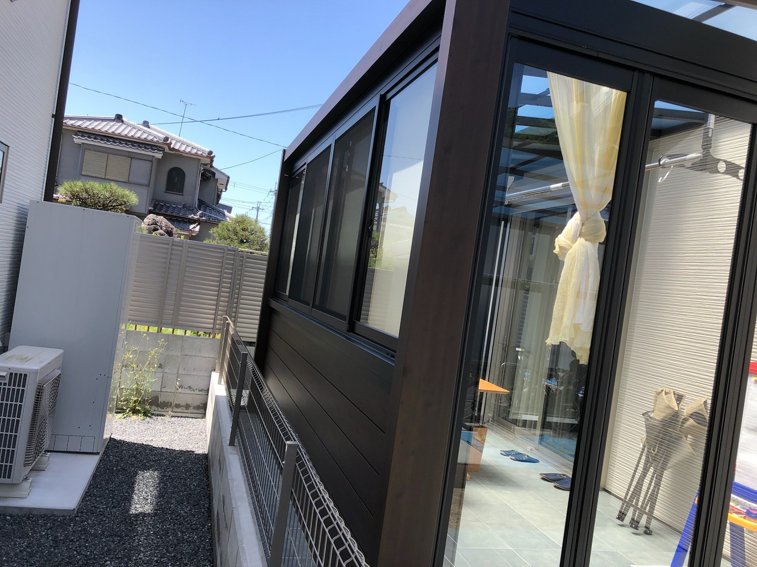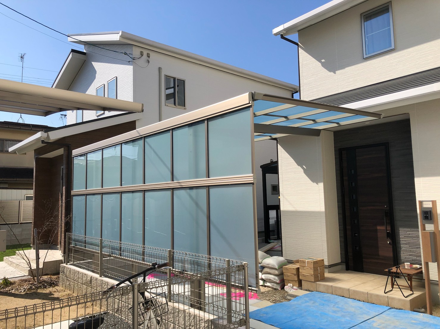 お子様が素足でも行き来できるようにと、サンルーム~タイルデッキ~人工芝の動線を確保させて頂きました。 駐輪場の側面パネルも2段で横雨にも負けない使い勝手のよいスペースに仕上がりました。