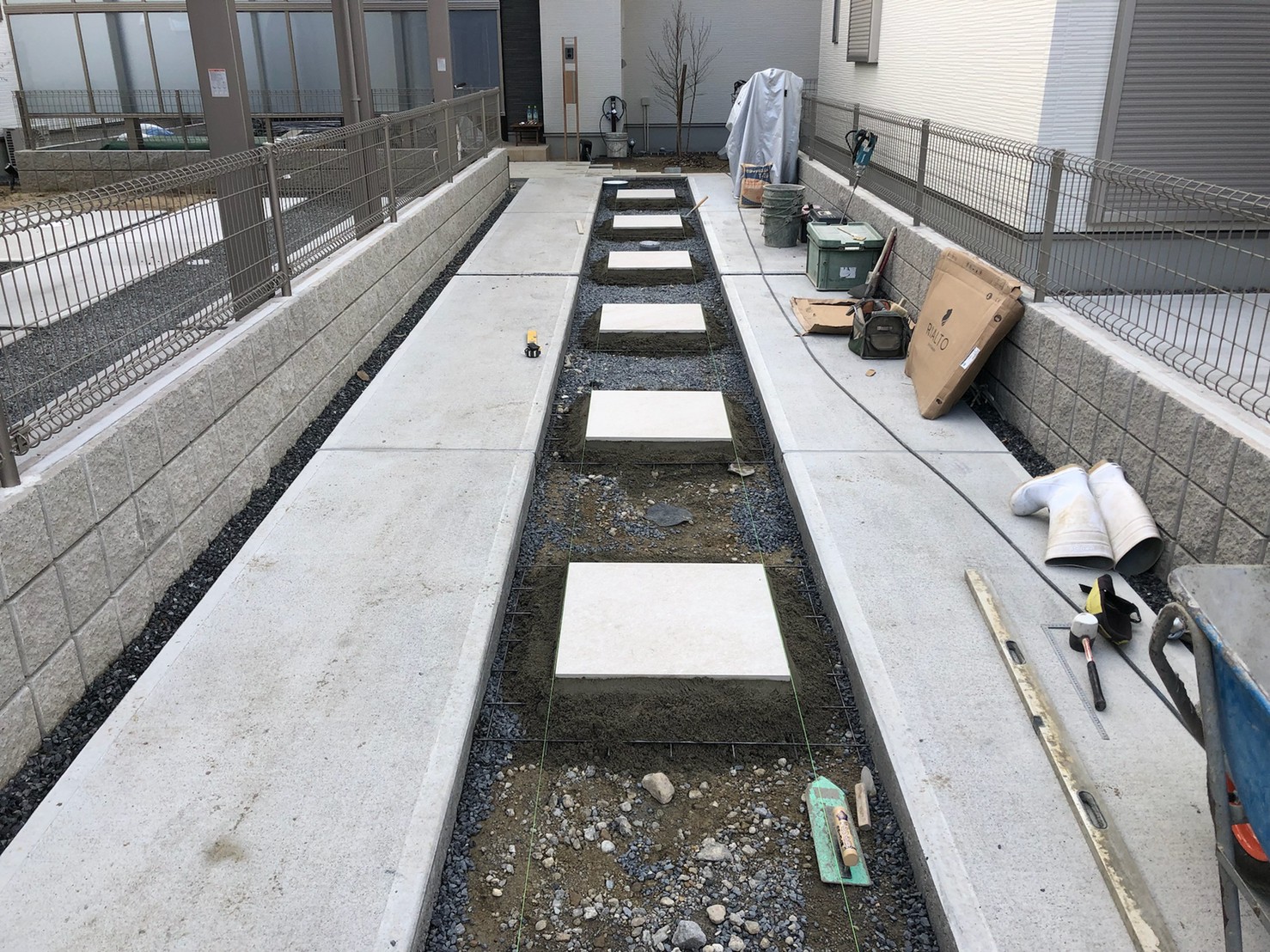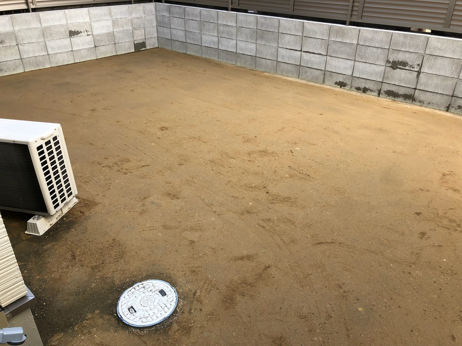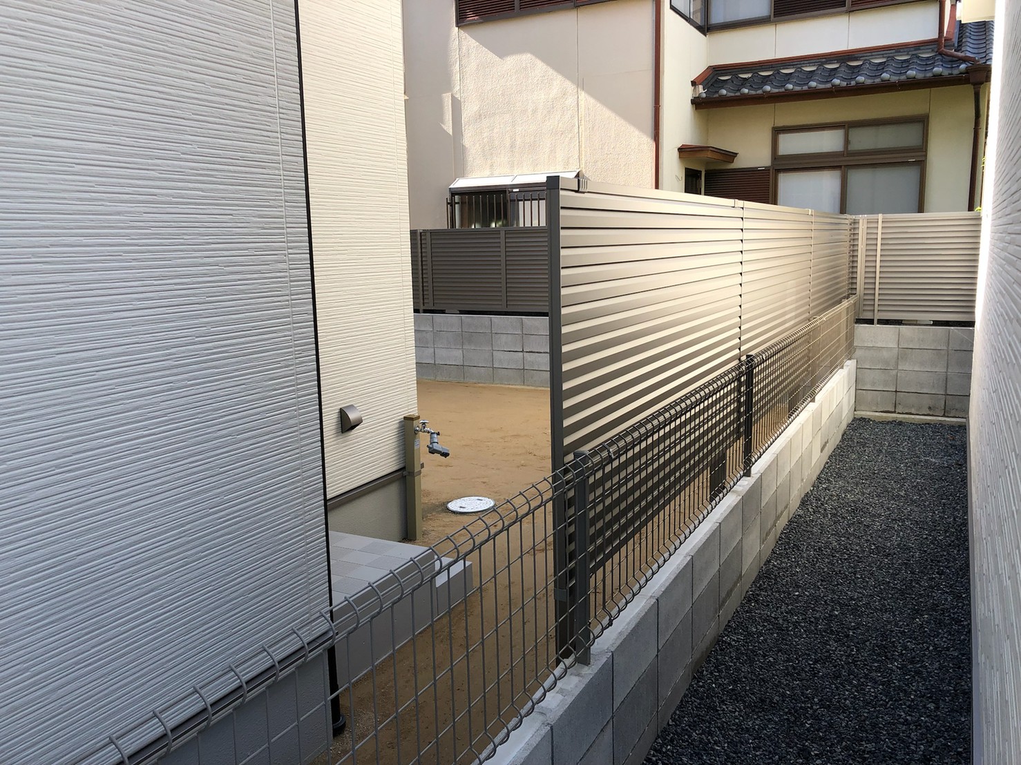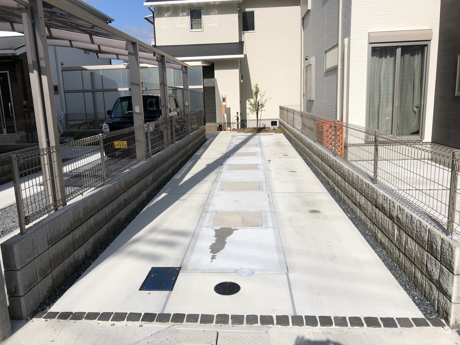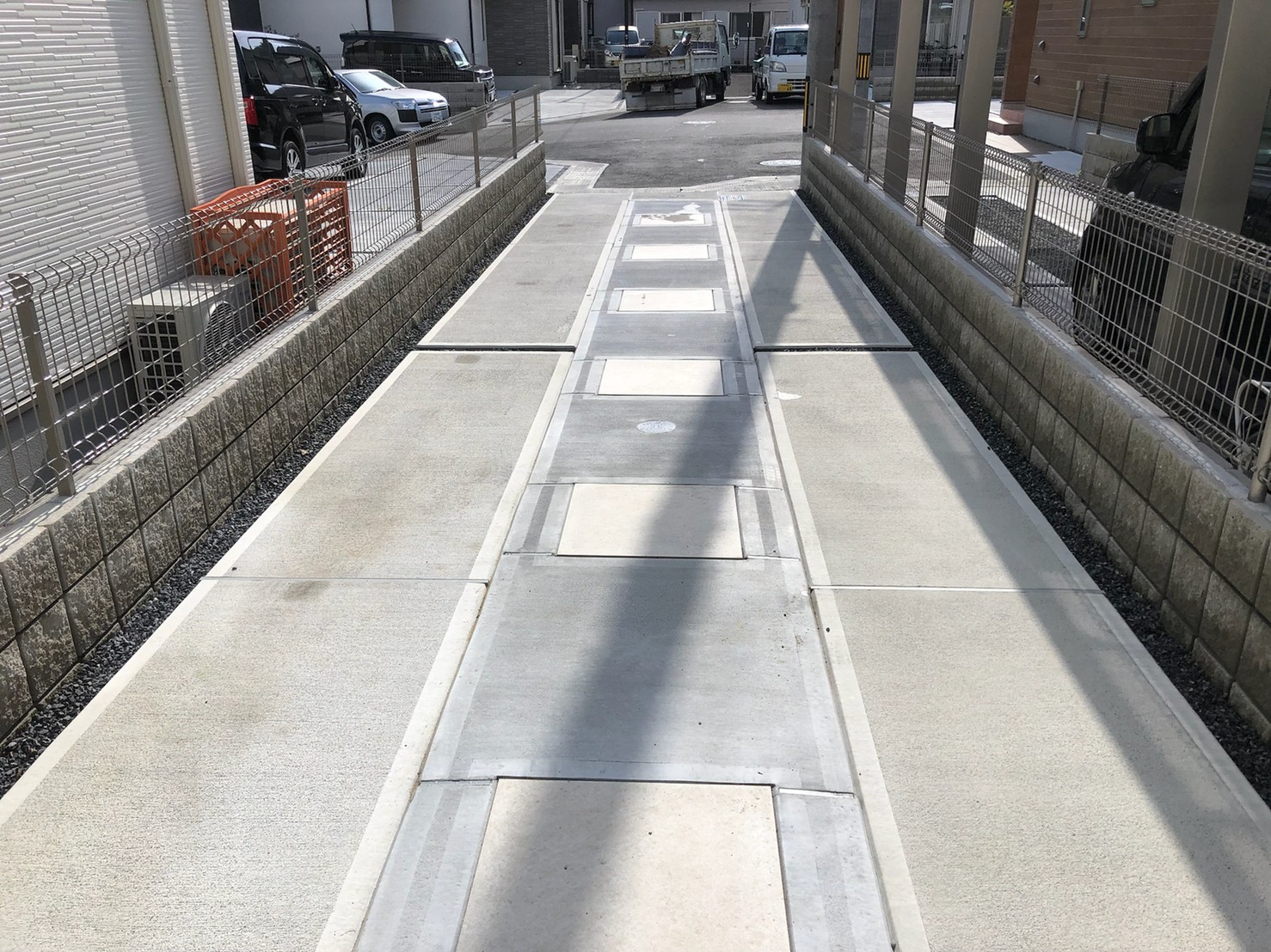 お子様が素足でも行き来できるようにと、サンルーム~タイルデッキ~人工芝の動線を確保させて頂きました。 駐輪場の側面パネルも2段で横雨にも負けない使い勝手のよいスペースに仕上がりました。