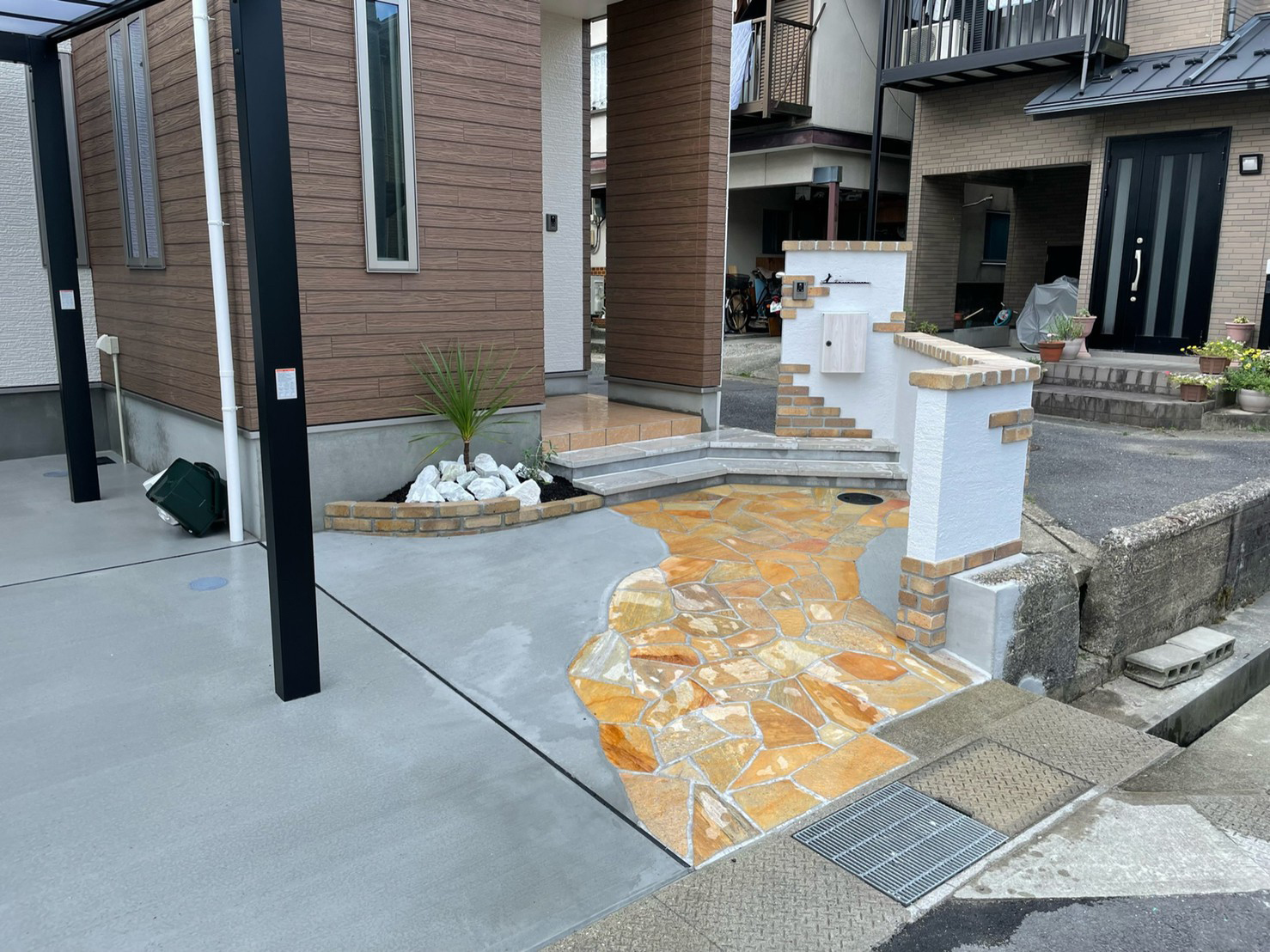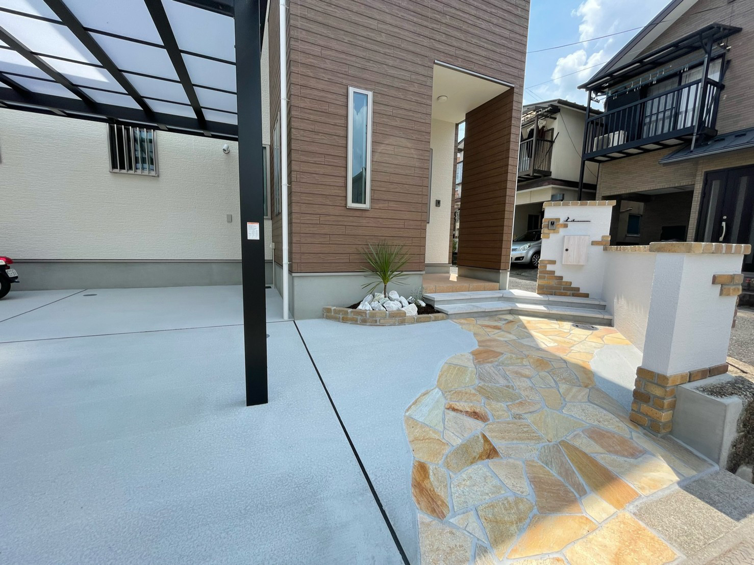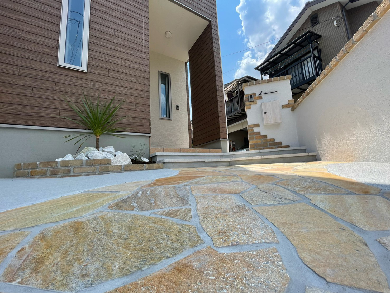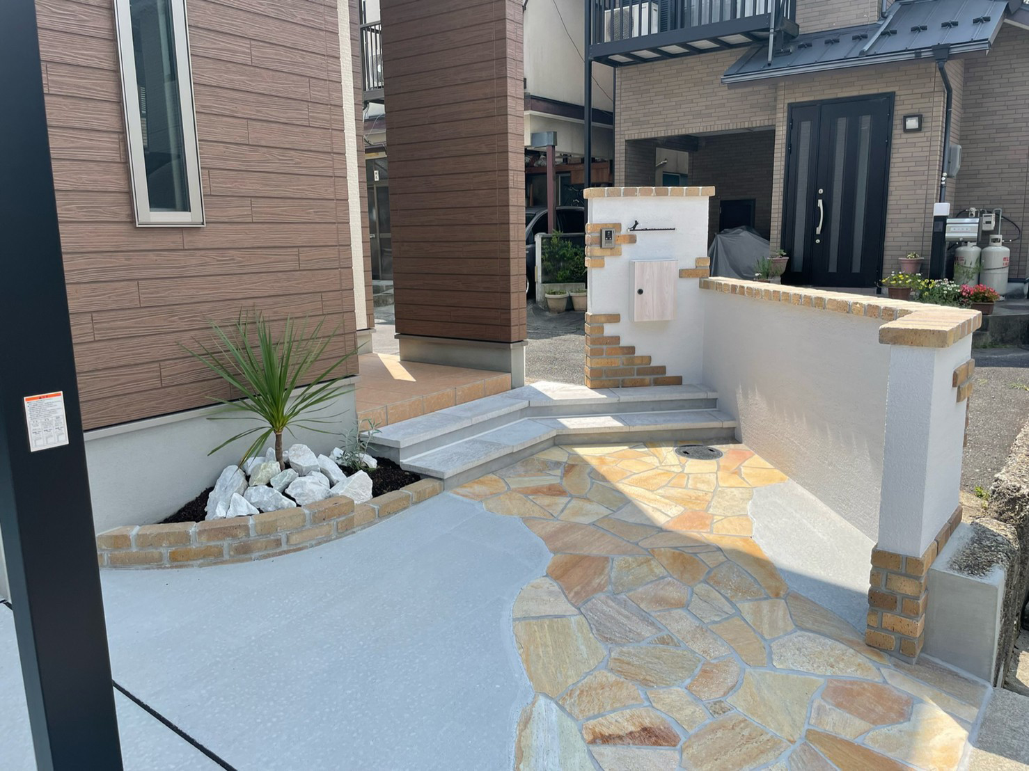 レンガと塗り壁で良い雰囲気にとのご依頼でした。 白い壁と暖かいレンガの質感がとてもマッチしていると喜んでもらえました。 植え込みもお手入れが楽な様にシンプルにさせていただきました。