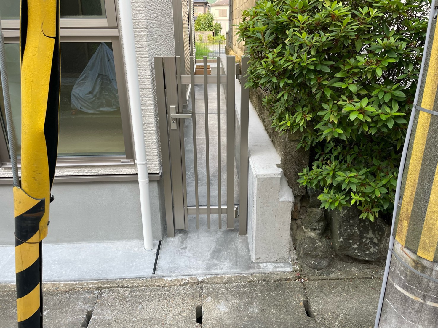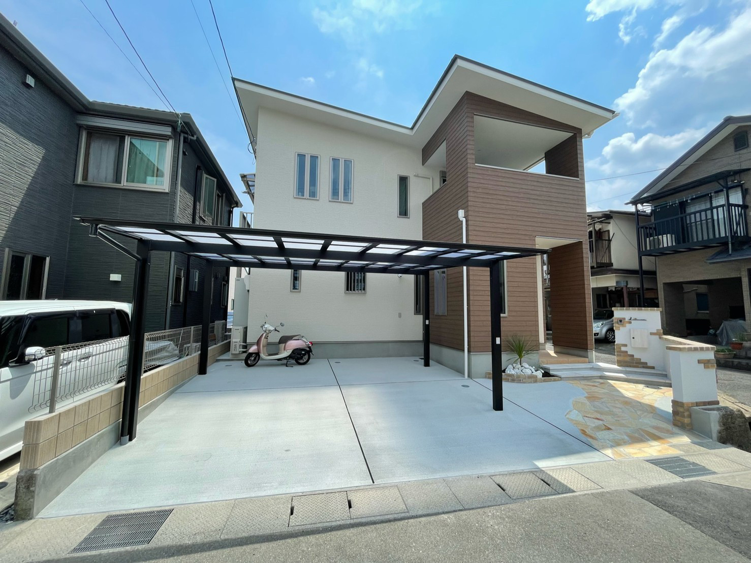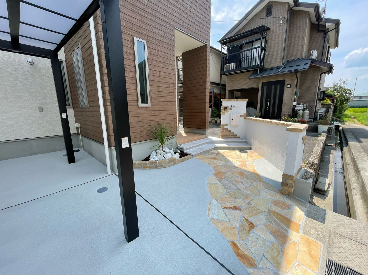 レンガと塗り壁で良い雰囲気にとのご依頼でした。 白い壁と暖かいレンガの質感がとてもマッチしていると喜んでもらえました。 植え込みもお手入れが楽な様にシンプルにさせていただきました。