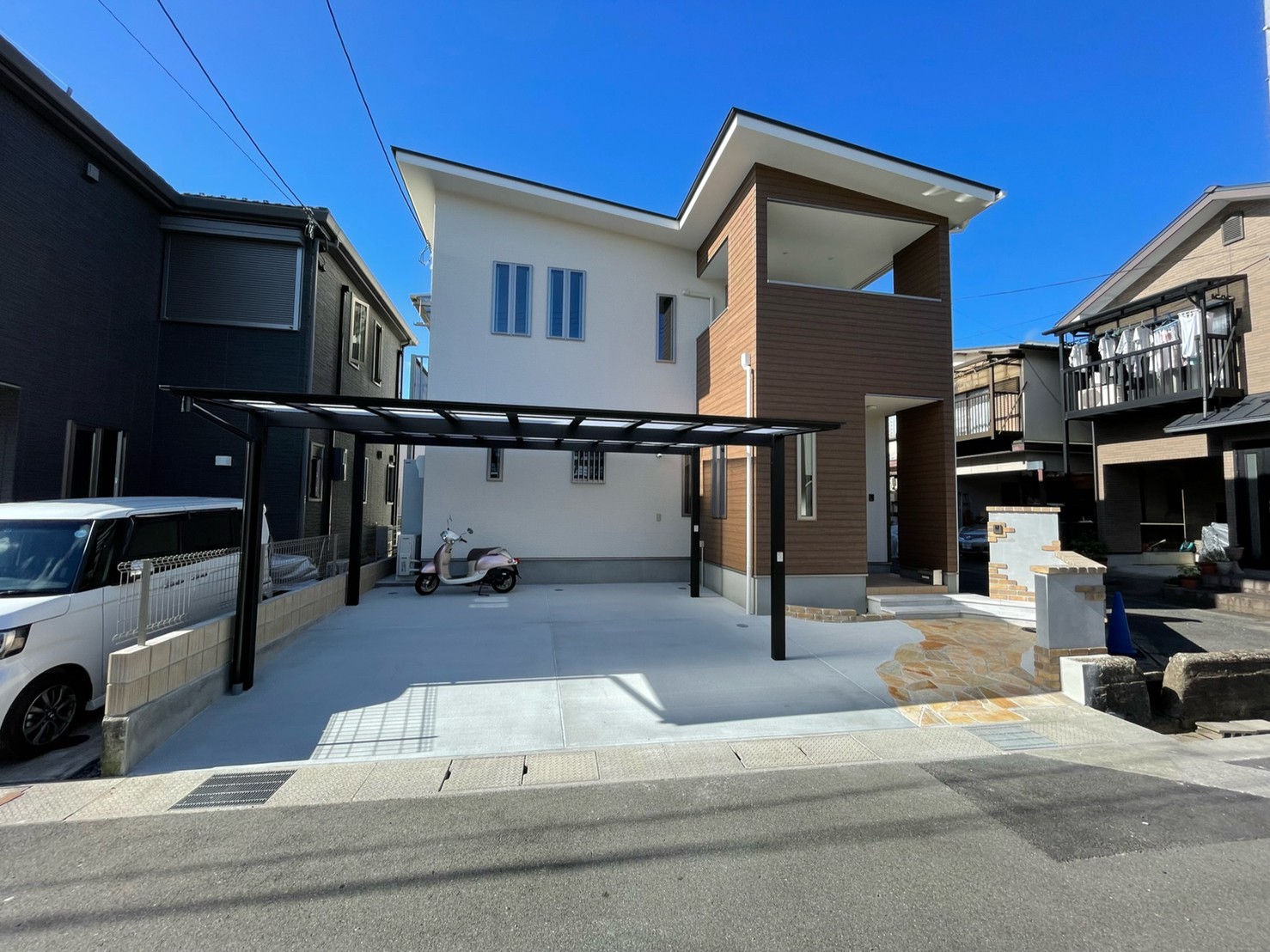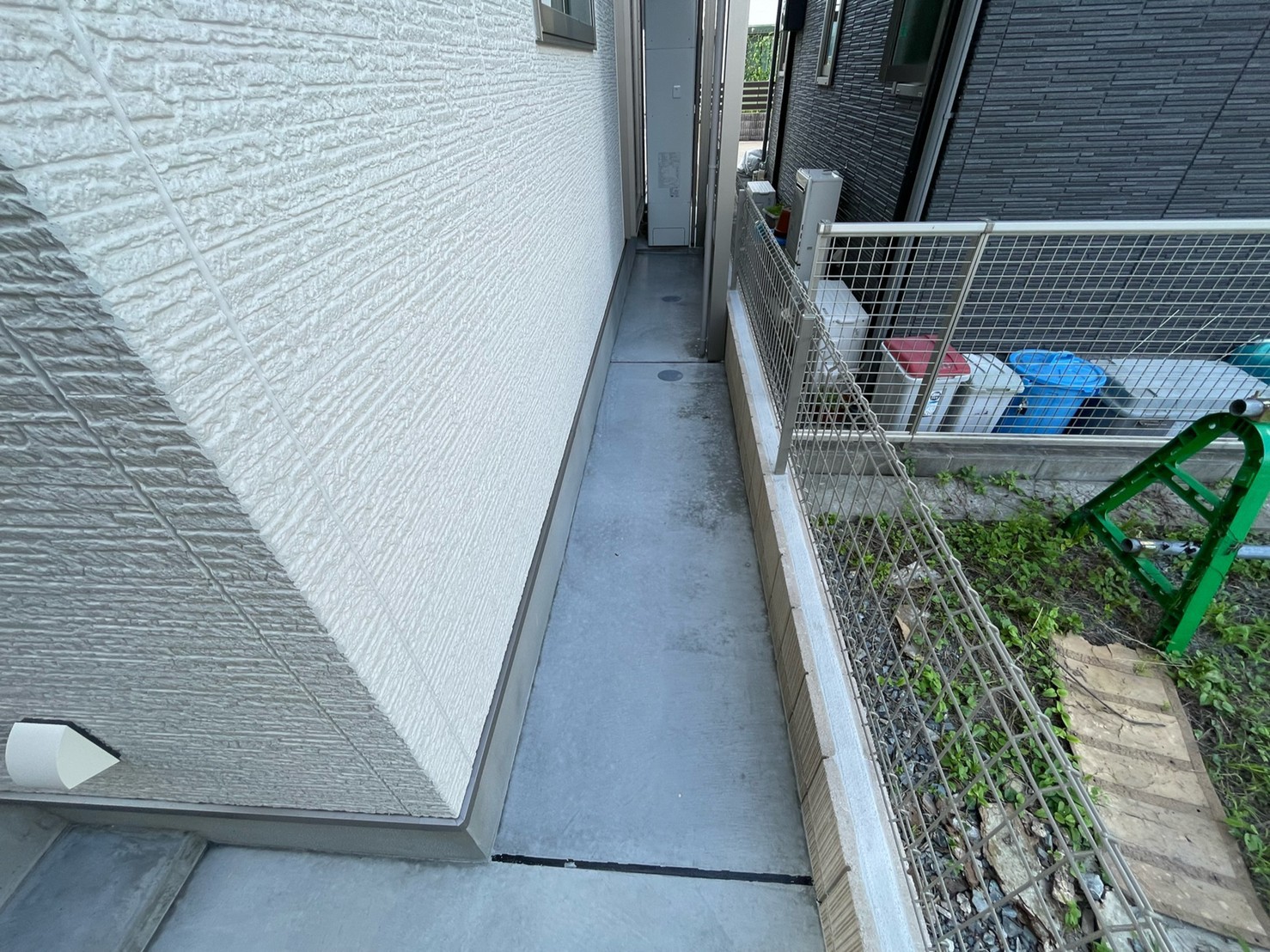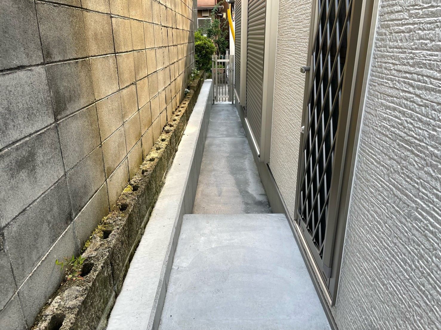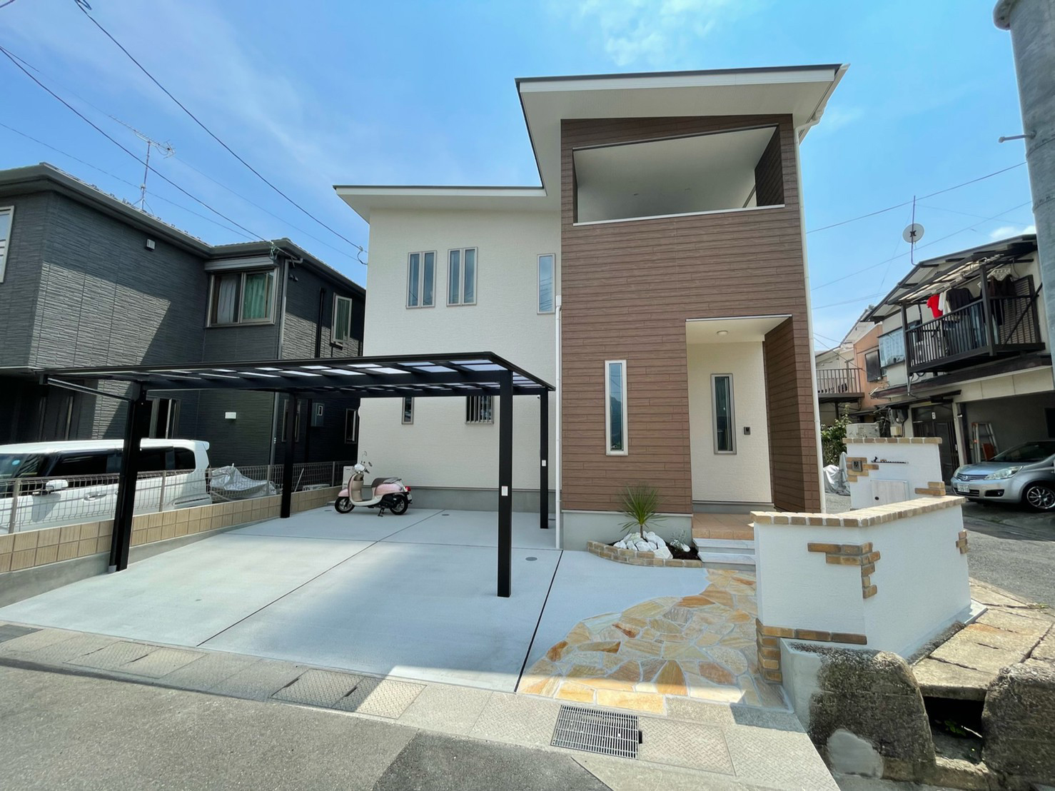 レンガと塗り壁で良い雰囲気にとのご依頼でした。 白い壁と暖かいレンガの質感がとてもマッチしていると喜んでもらえました。 植え込みもお手入れが楽な様にシンプルにさせていただきました。