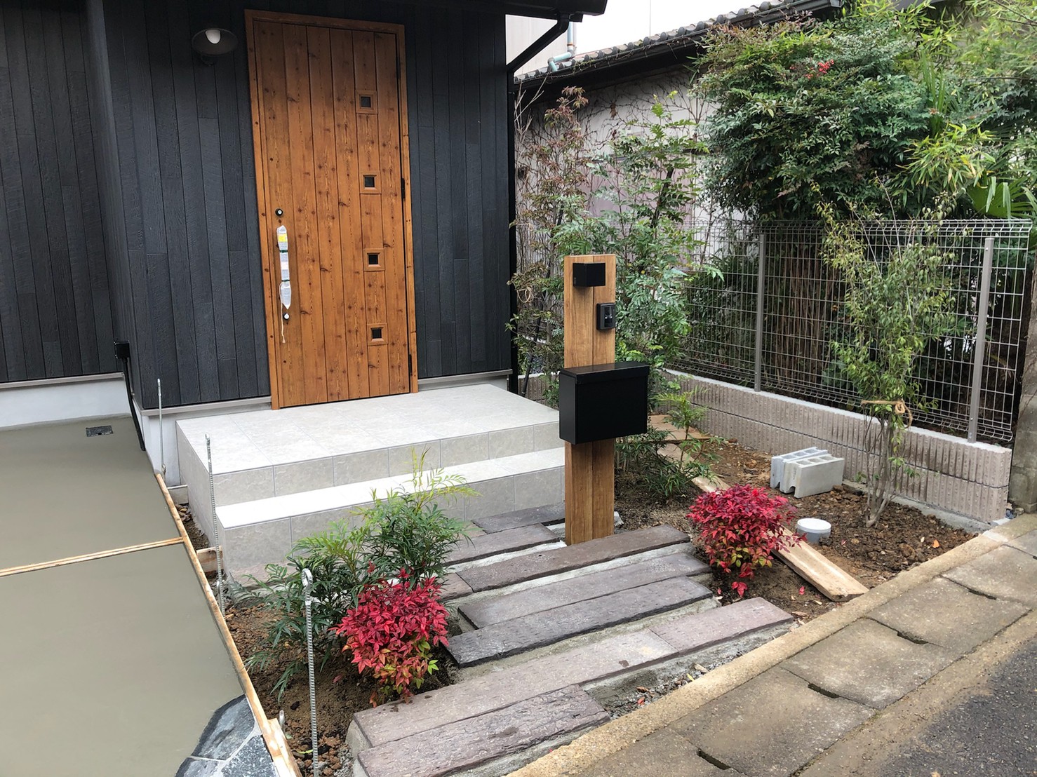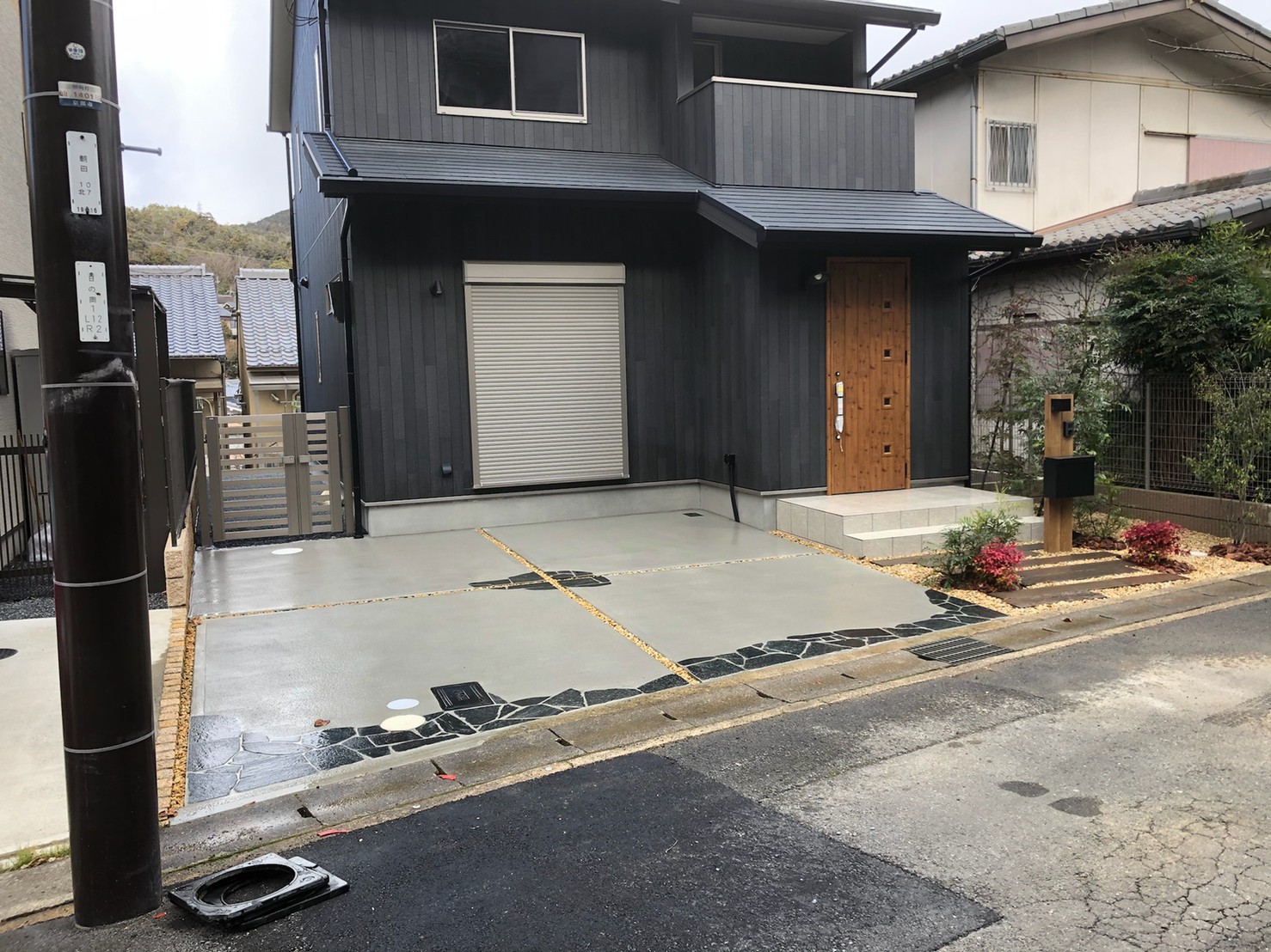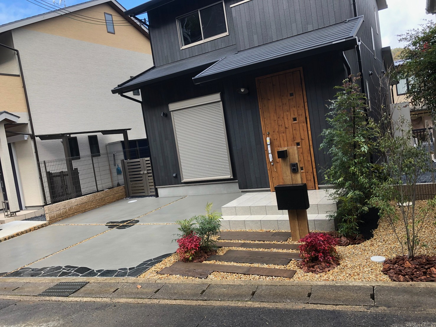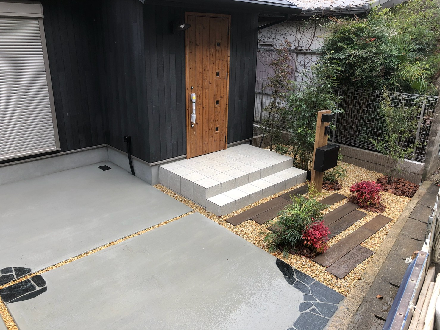 ガレージ土間に乱系石とスリット、アプローチには人工木を施工させて頂きました。 風致地区で植栽・化粧砂利 周りも砕石敷きに仕上がりました。 侵入防止のアルミ扉も親子ドアで大きな開口が取れるため大変使い勝手が良いです。