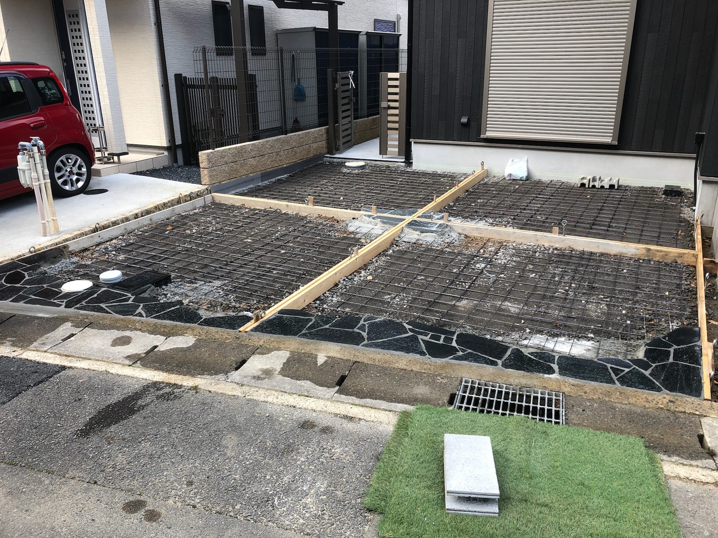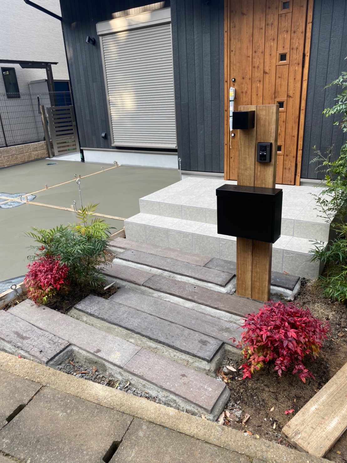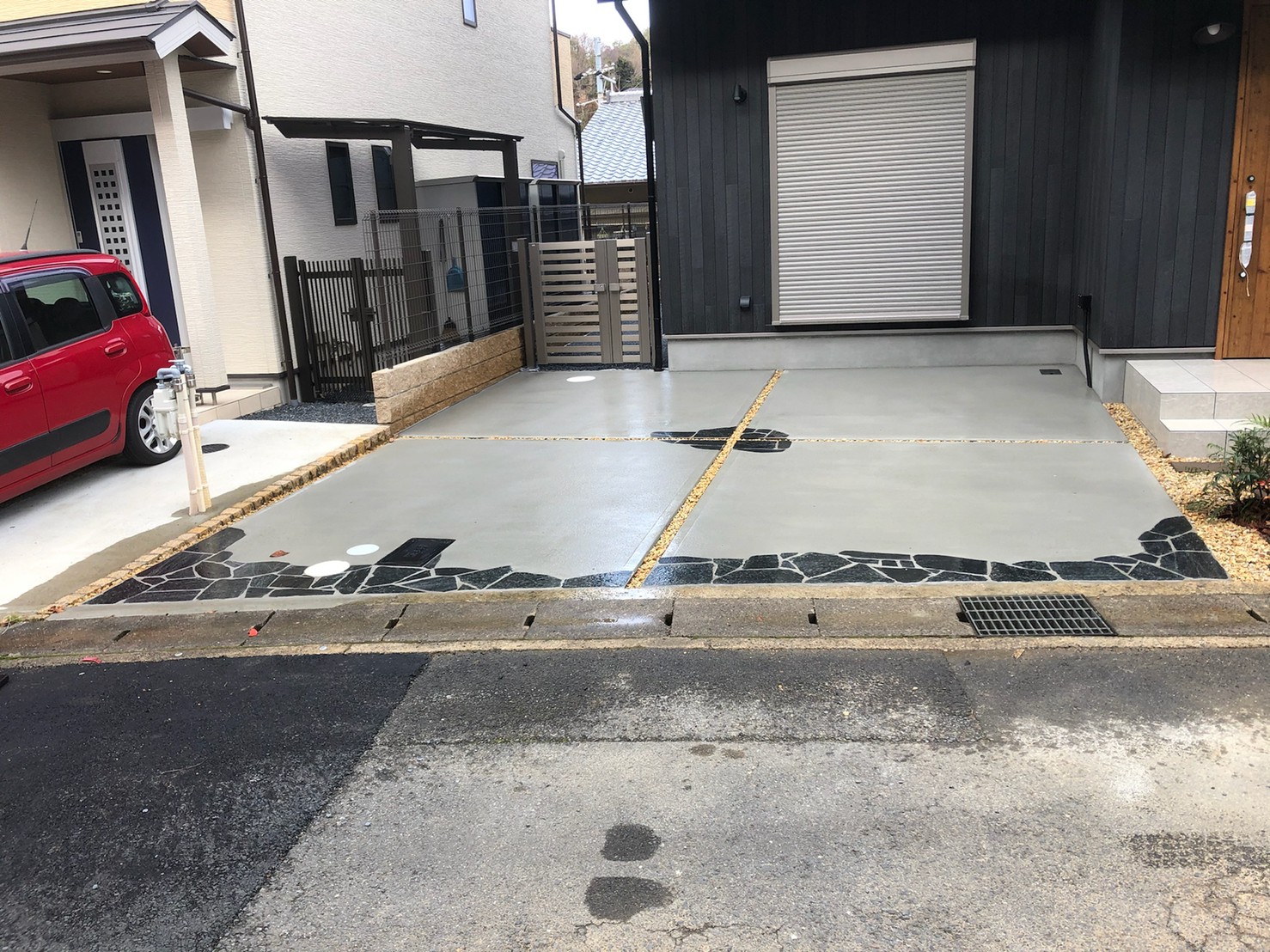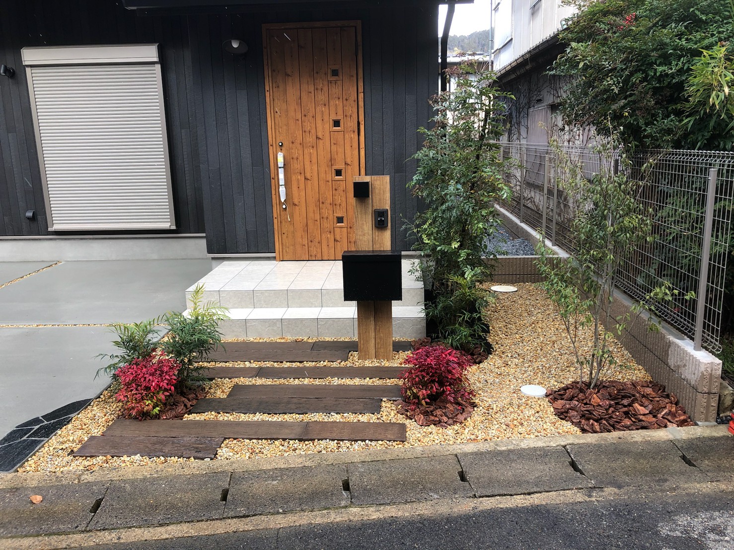 ガレージ土間に乱系石とスリット、アプローチには人工木を施工させて頂きました。 風致地区で植栽・化粧砂利 周りも砕石敷きに仕上がりました。 侵入防止のアルミ扉も親子ドアで大きな開口が取れるため大変使い勝手が良いです。