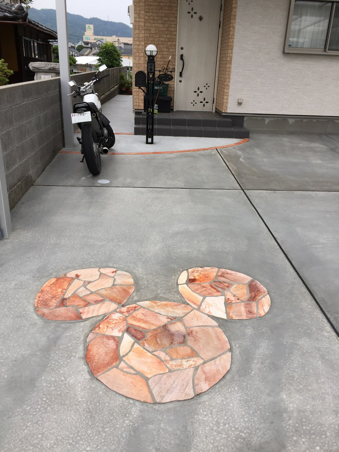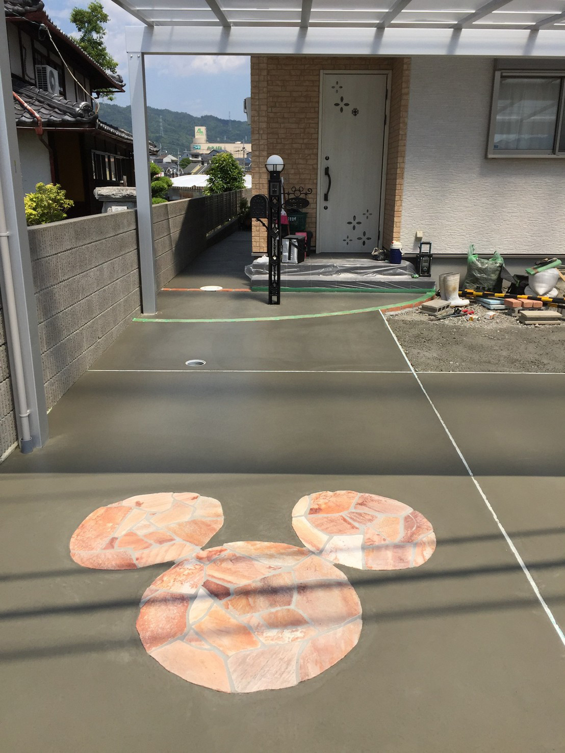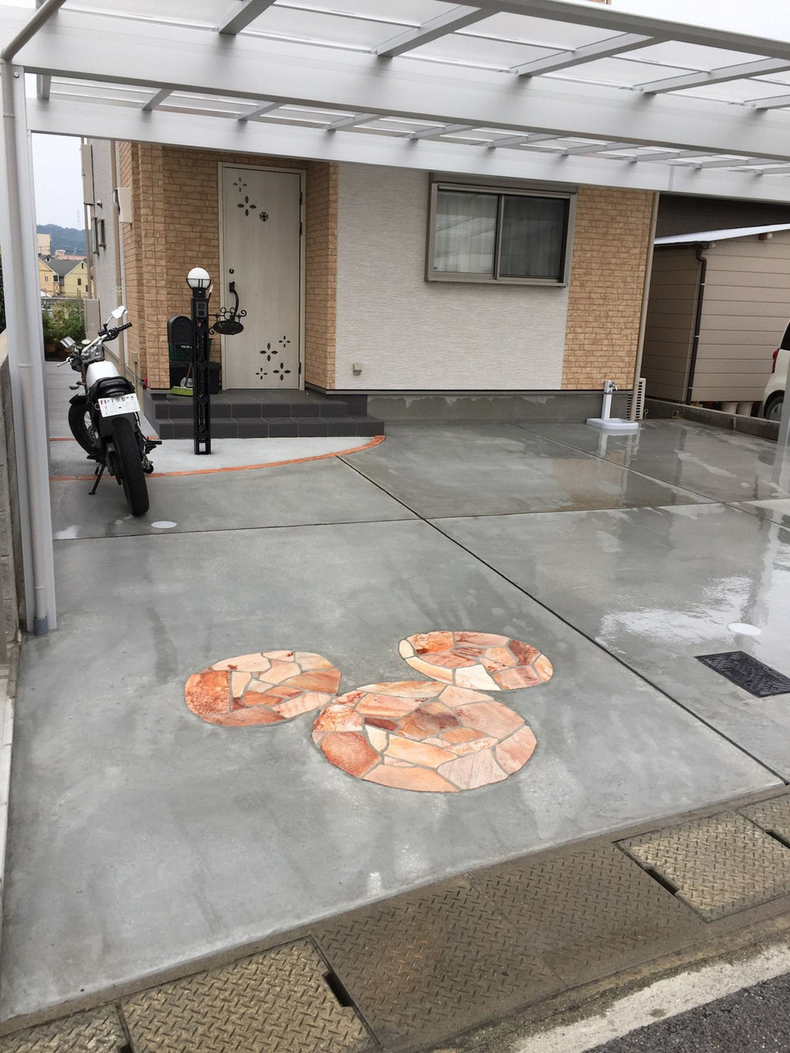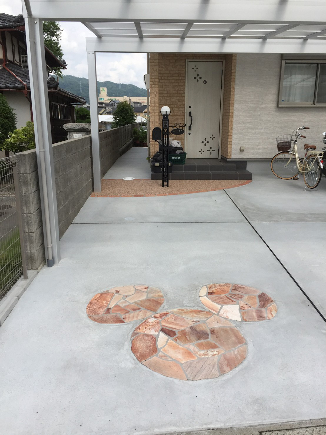 ディズニーが大好きと言う奥様のご要望で機能門柱はディズニー。 コンクリート土間にも、ぽい感じを乱系石でかたどりました。 カーポートは車3台が入るサイズ。かなり広々使えます。