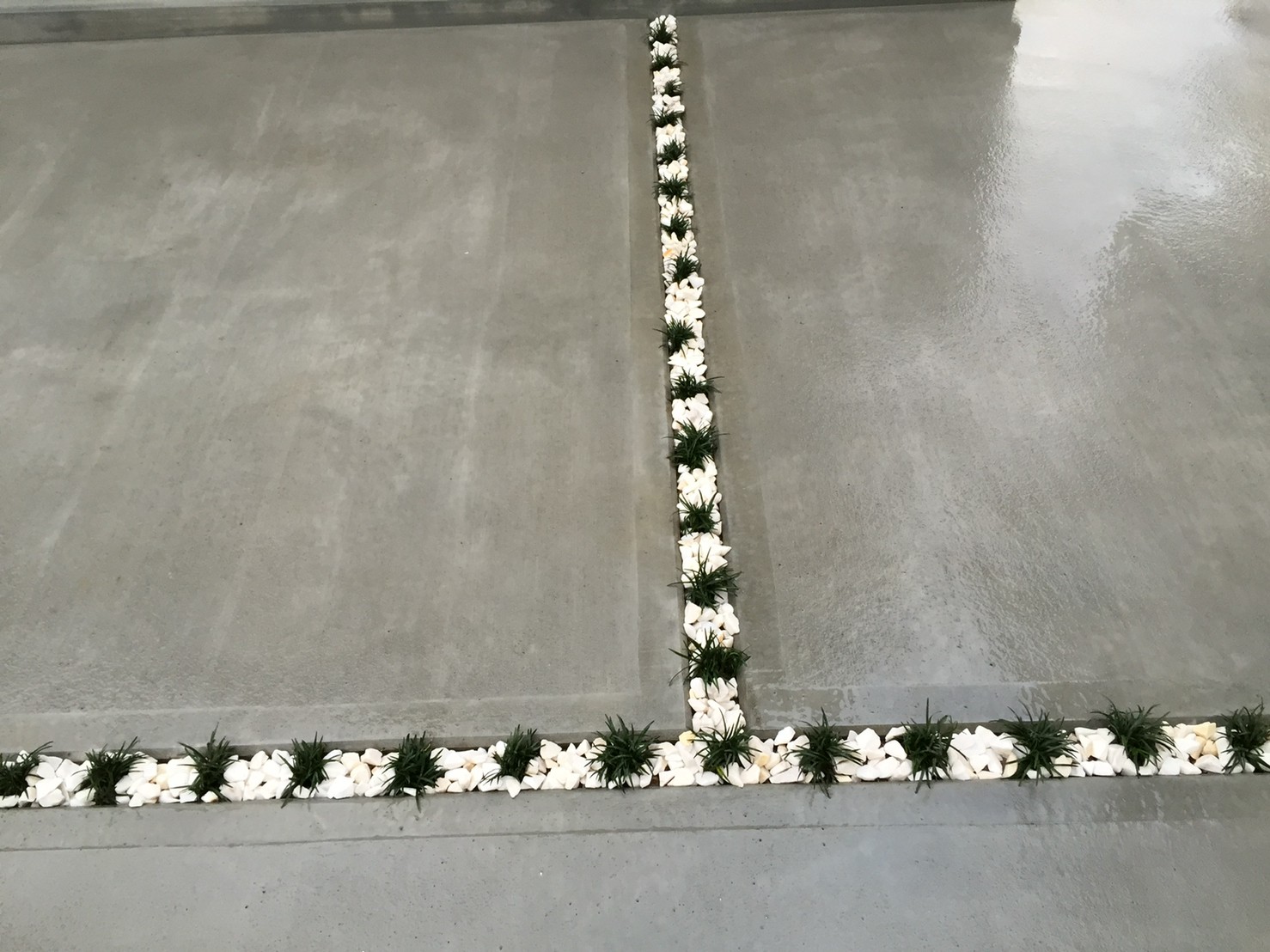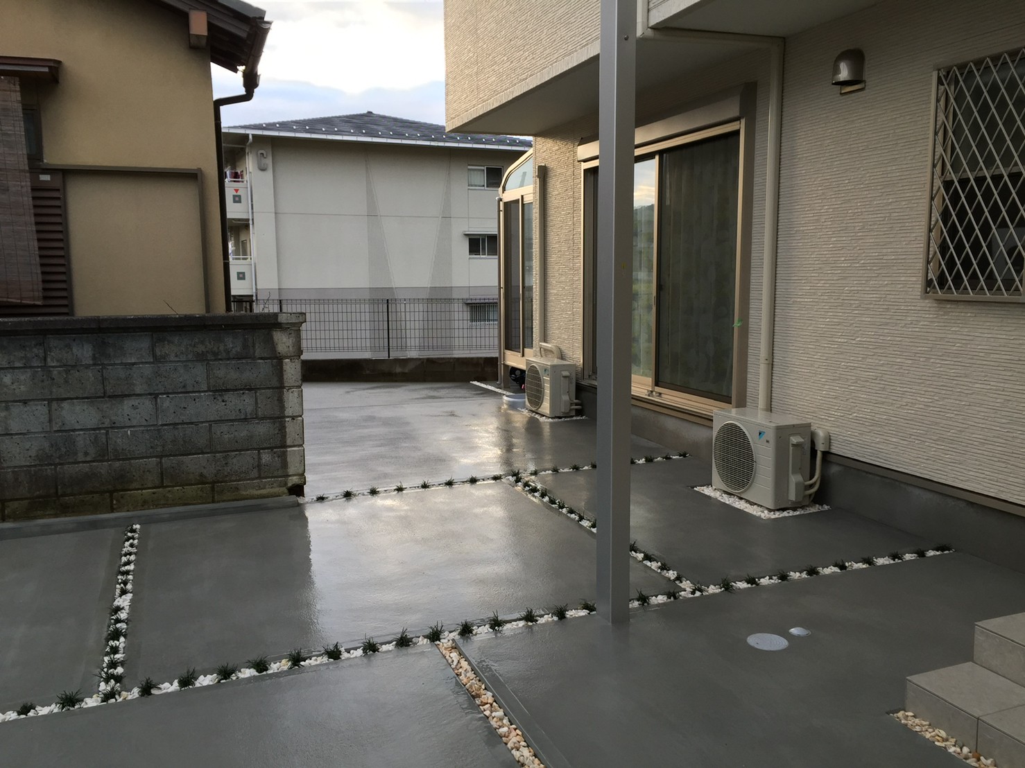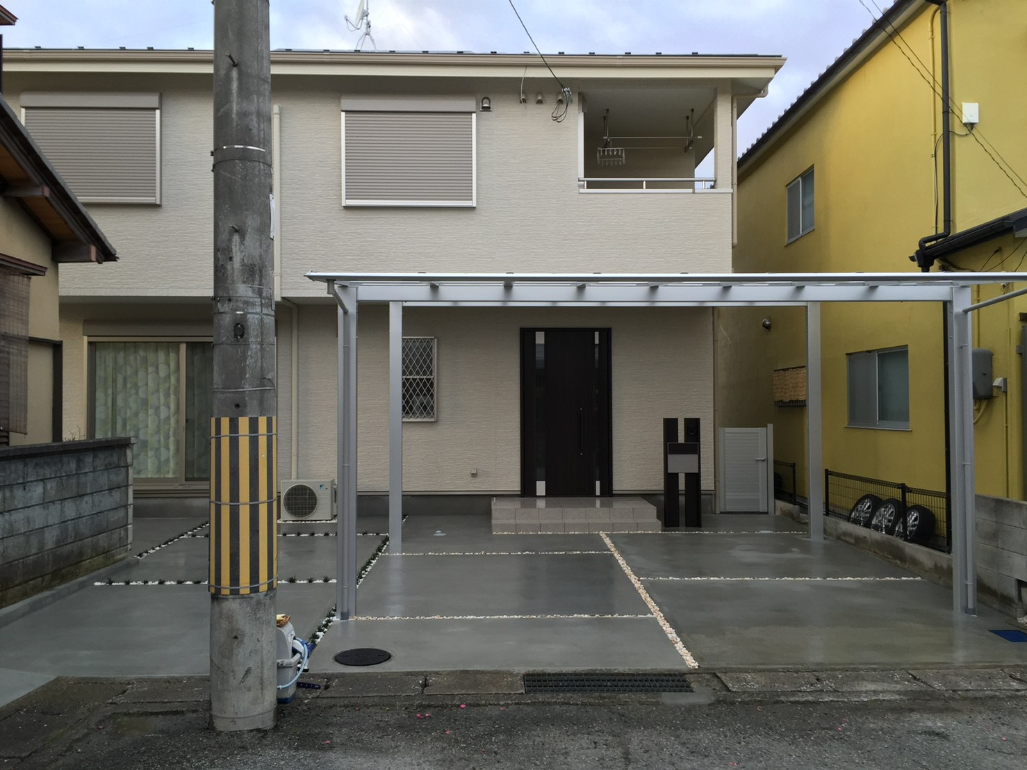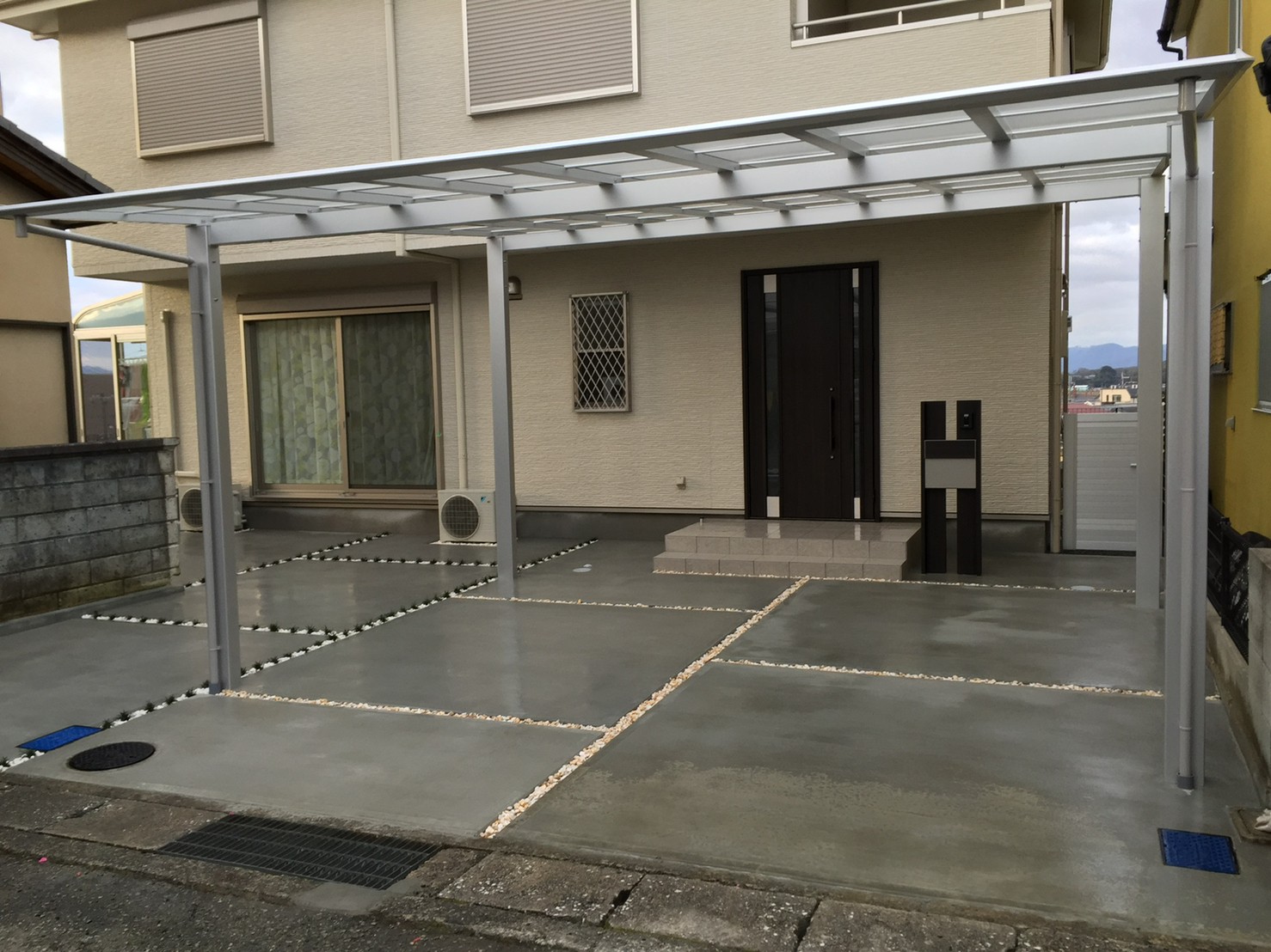 土間面積が広く派手にすれば費用面もかさみます。 化粧砂利 タマリュウの入ったスリット土間で、コンクリートのベタ打ち感が無くなるように気をつけました。 カーポートもついてスッキリ仕上がりました。