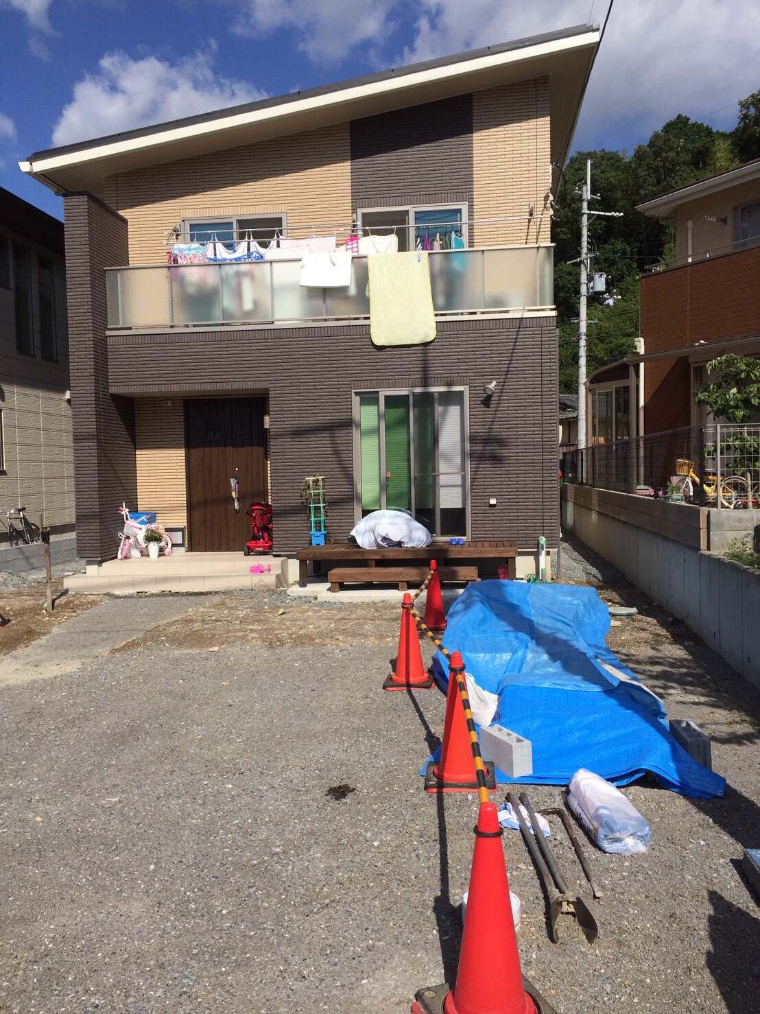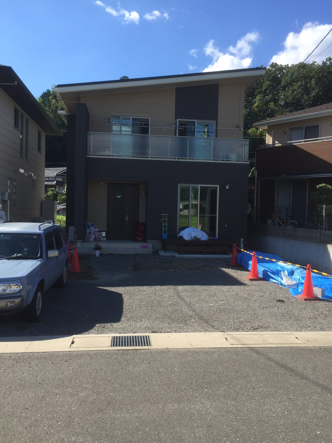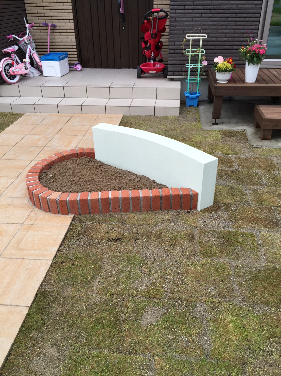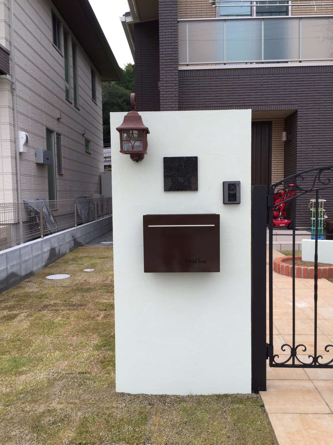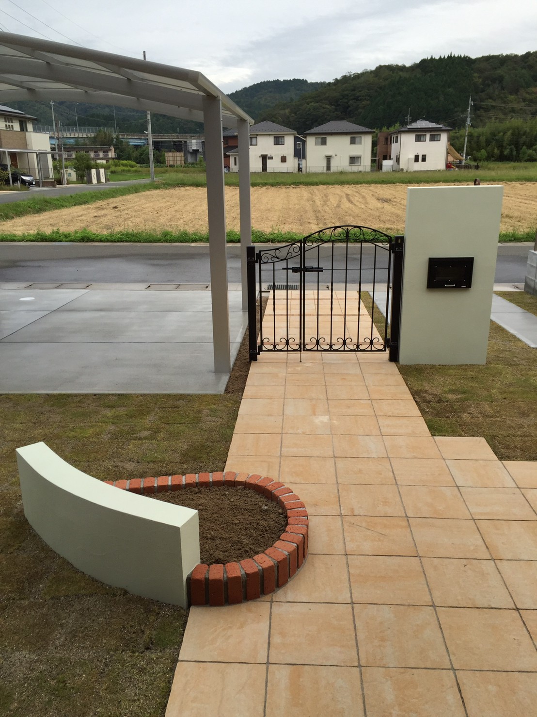玄関までまっすぐに続くアプローチですが、花壇をもうけ植栽で目隠し出来るようになっています。 植栽はお客様が植えられるので今回はなしです。 天然芝と塗り壁、ロートアルミ門扉がマッチしています。