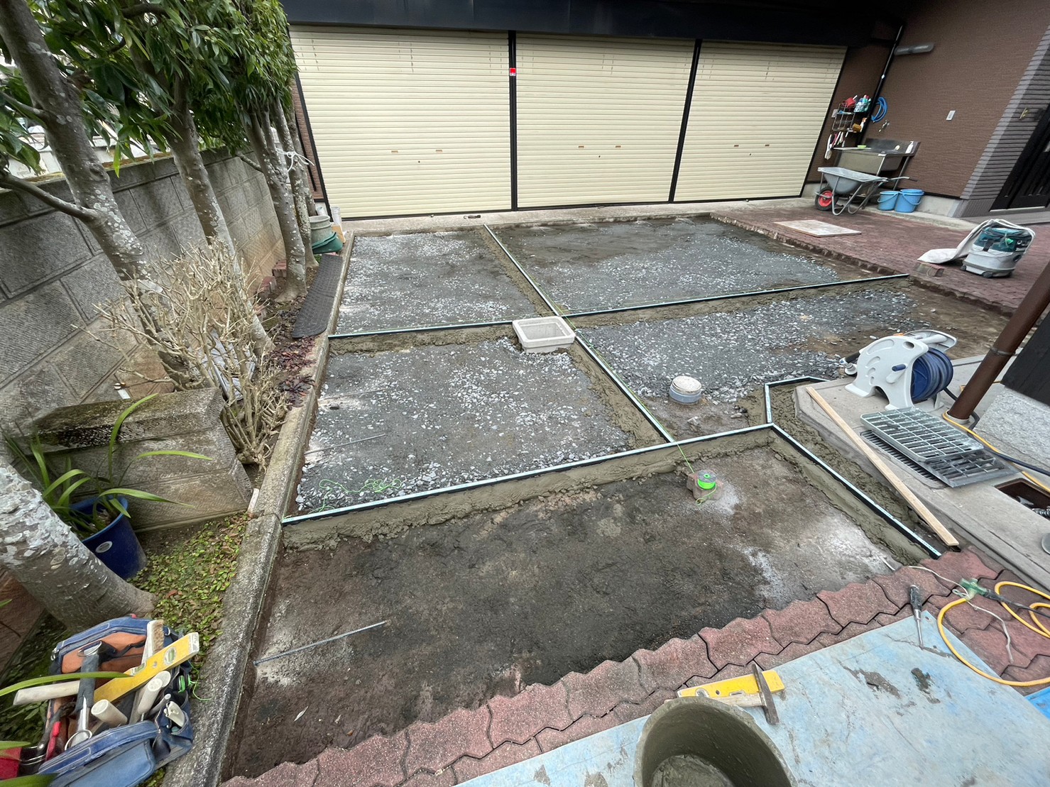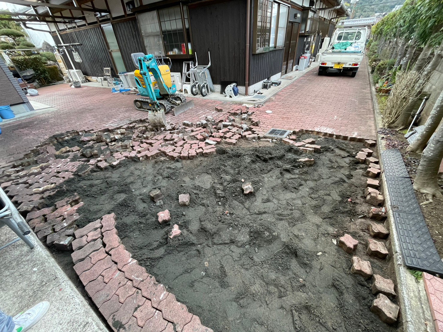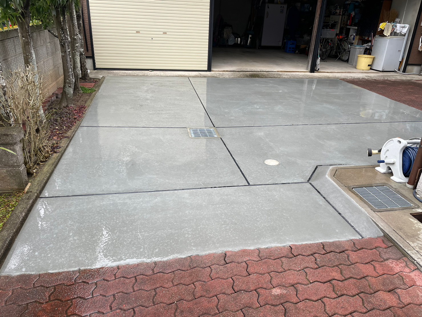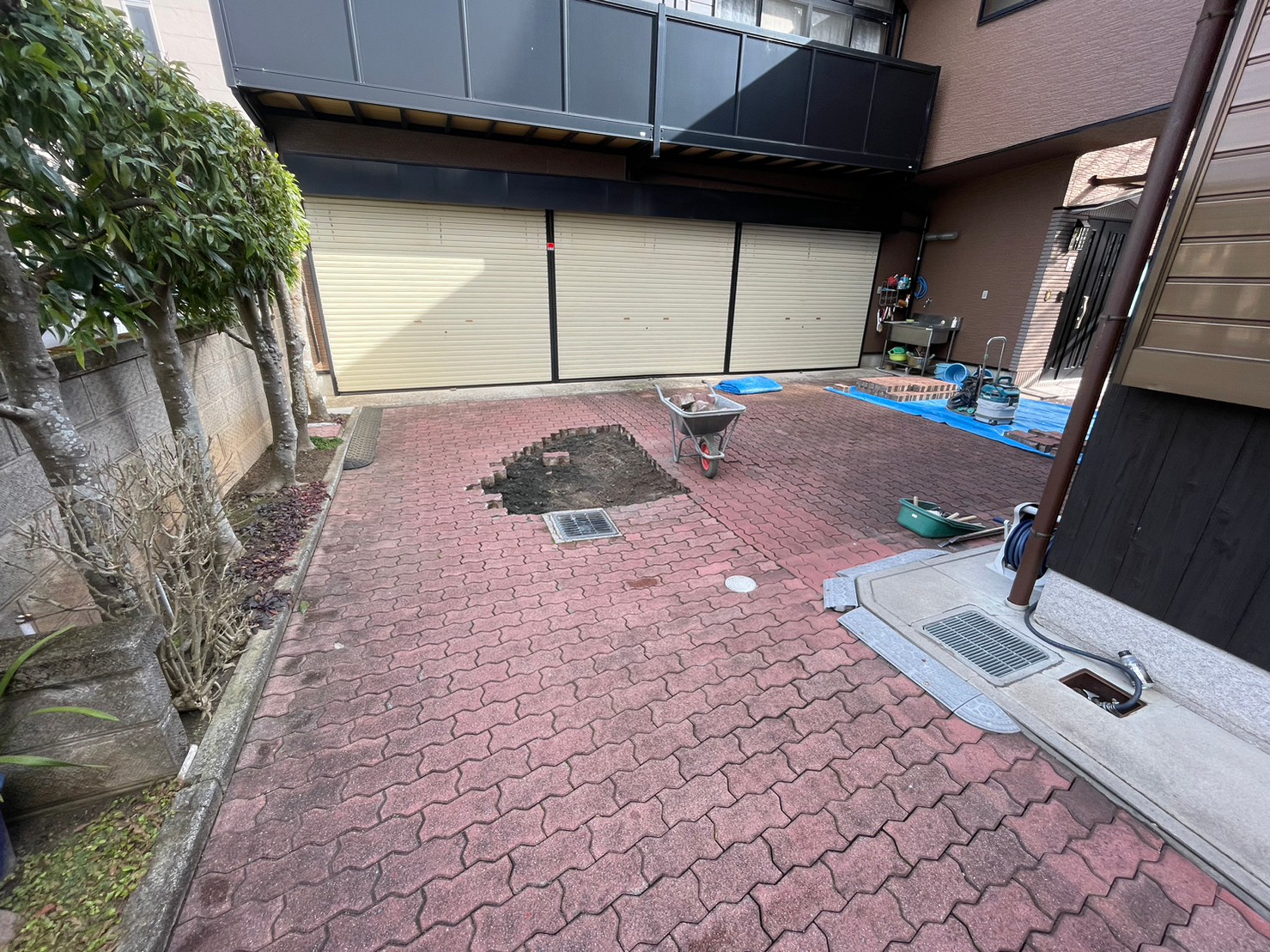 ガタガタになってしまっていたインターロッキングをめくり、コンクリート土間にしてスムーズにお車の出し入れが出来るようになりました。 玄関には石をくり抜き、車止め(スペースガード160パイ)を取り付け致しました。