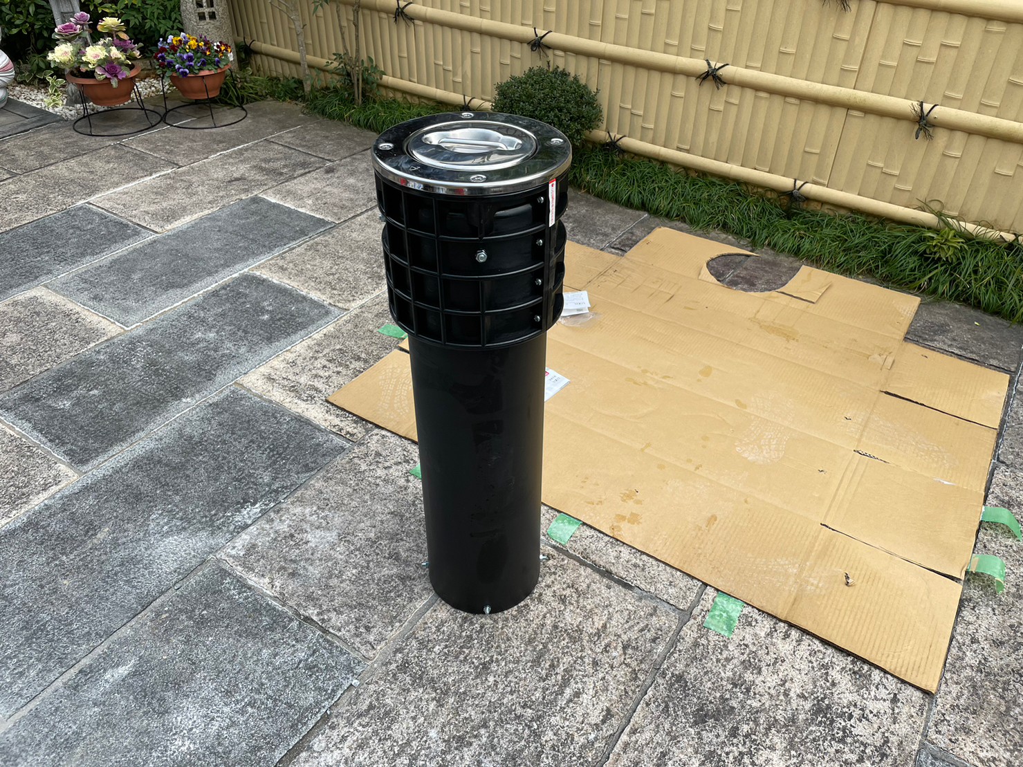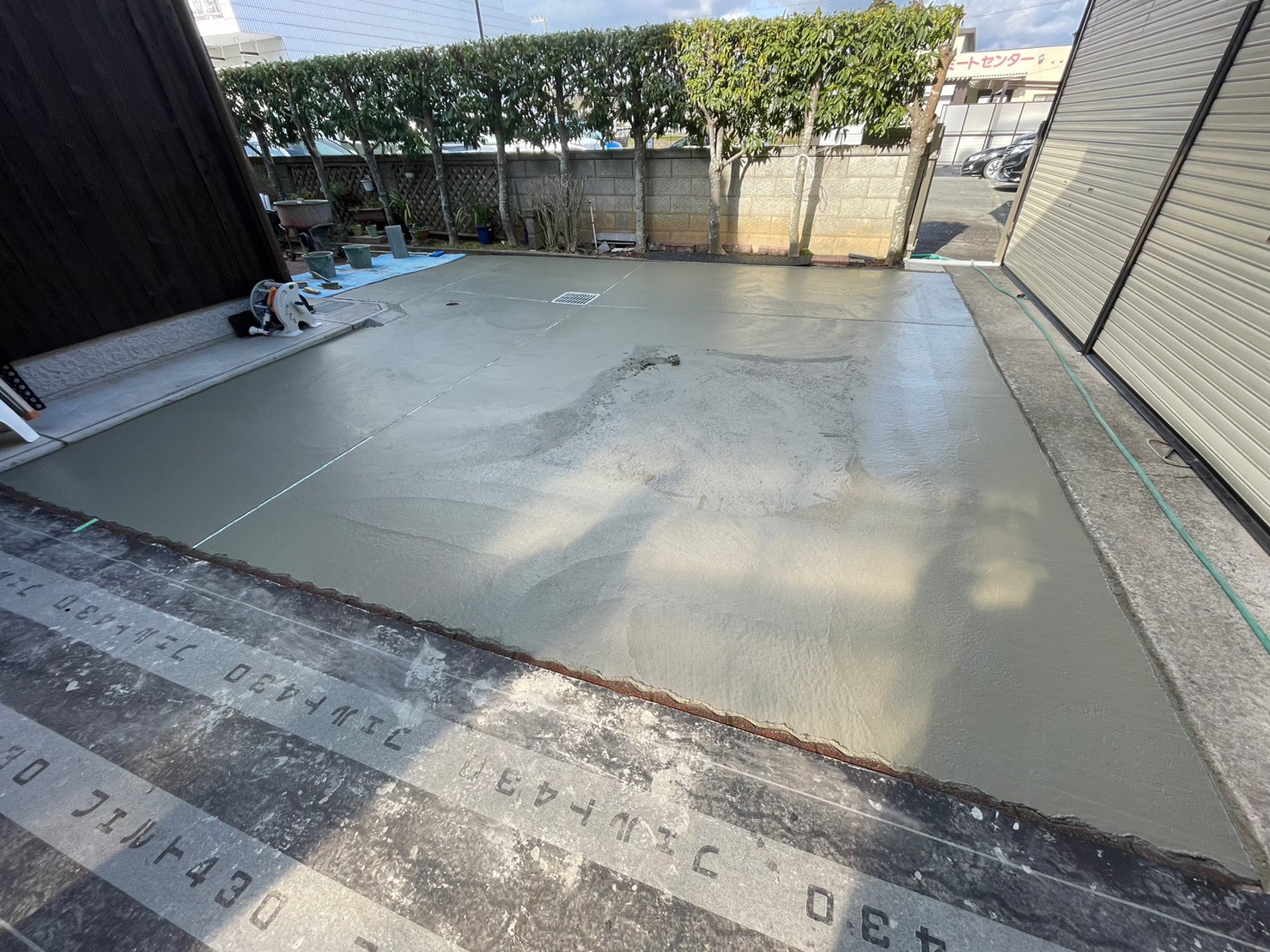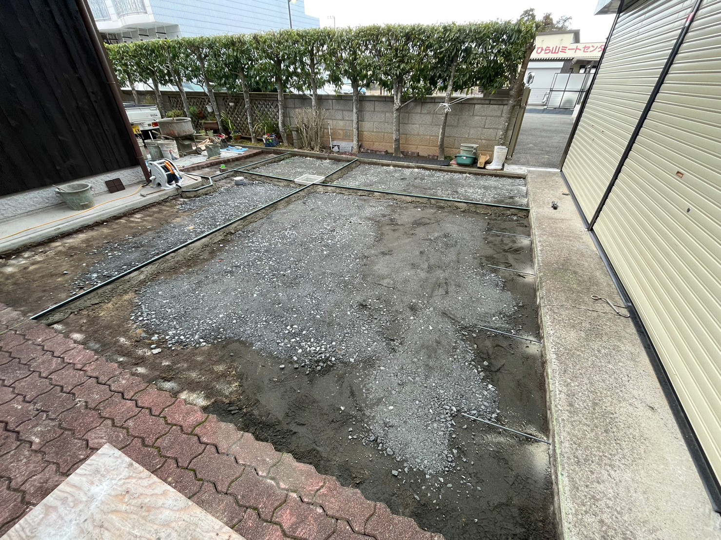 ガタガタになってしまっていたインターロッキングをめくり、コンクリート土間にしてスムーズにお車の出し入れが出来るようになりました。 玄関には石をくり抜き、車止め(スペースガード160パイ)を取り付け致しました。