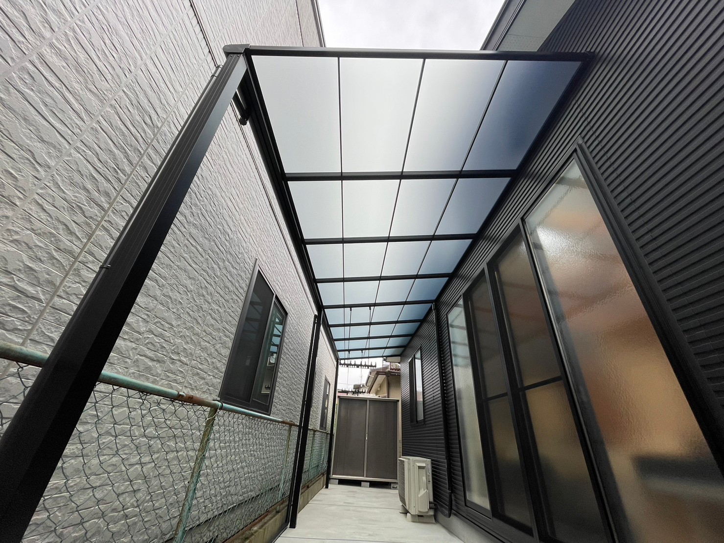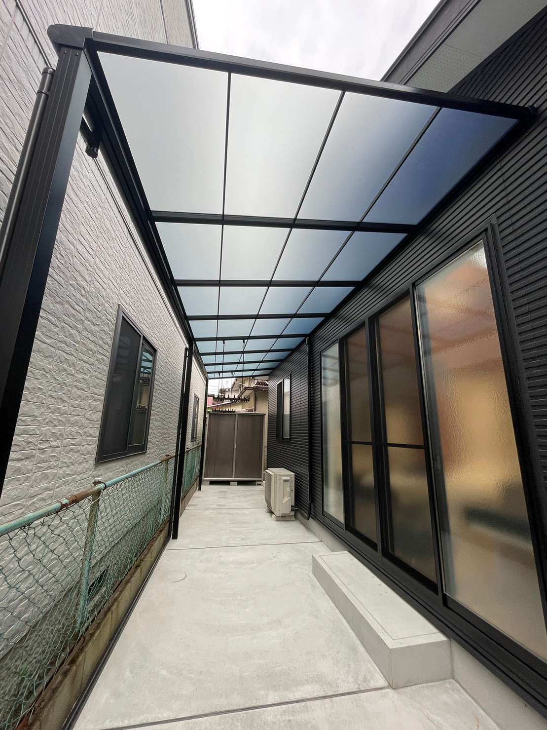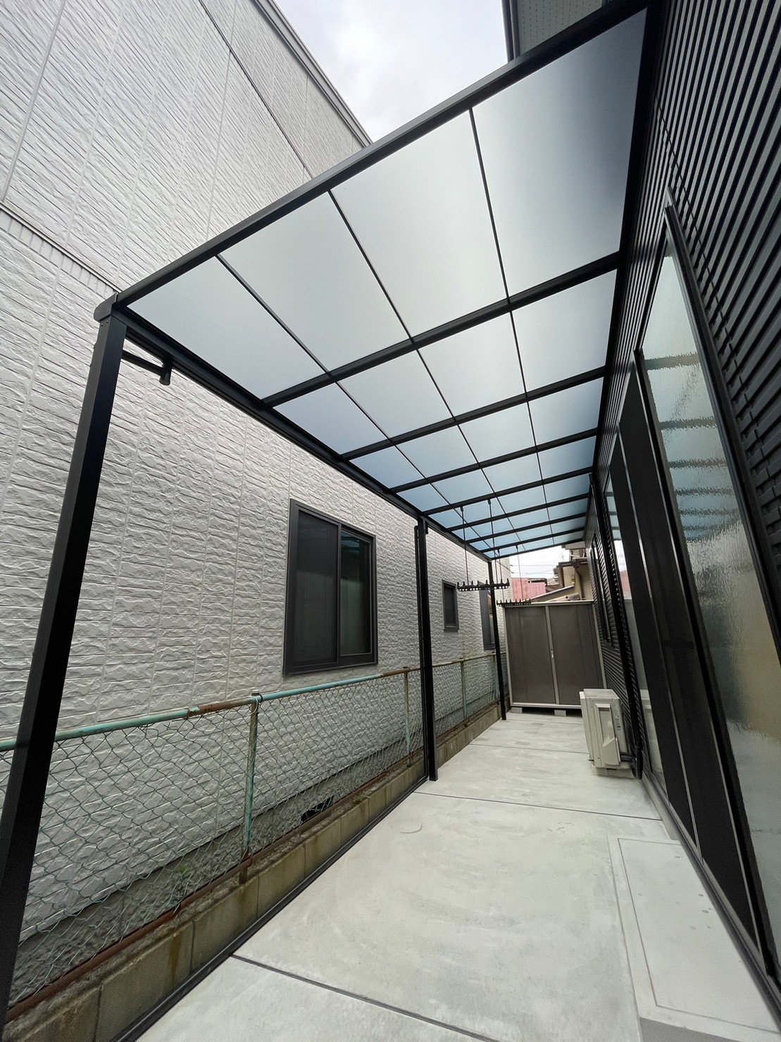 今回はテラス屋根施工させて頂きました。三協アルミのレボリューFという商品です。 斜めにカットして施工も可能です。今回は斜めカット施工です。 雨の日や強い日差しなんかもシャットアウトしてくれます。
