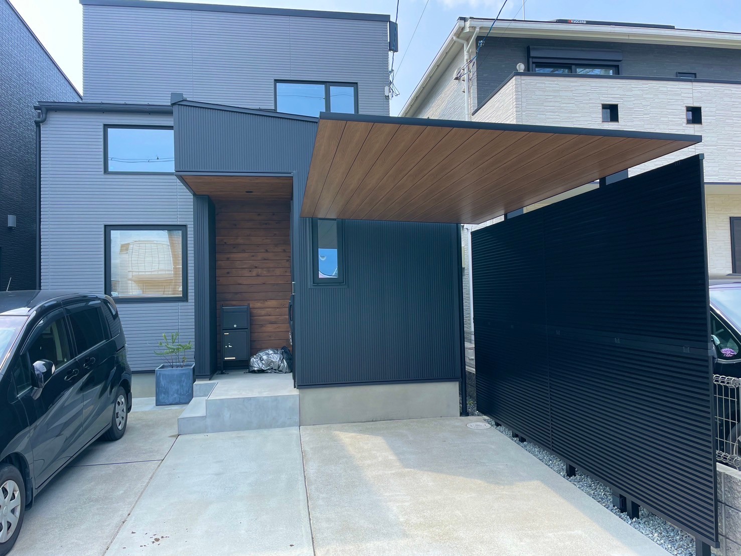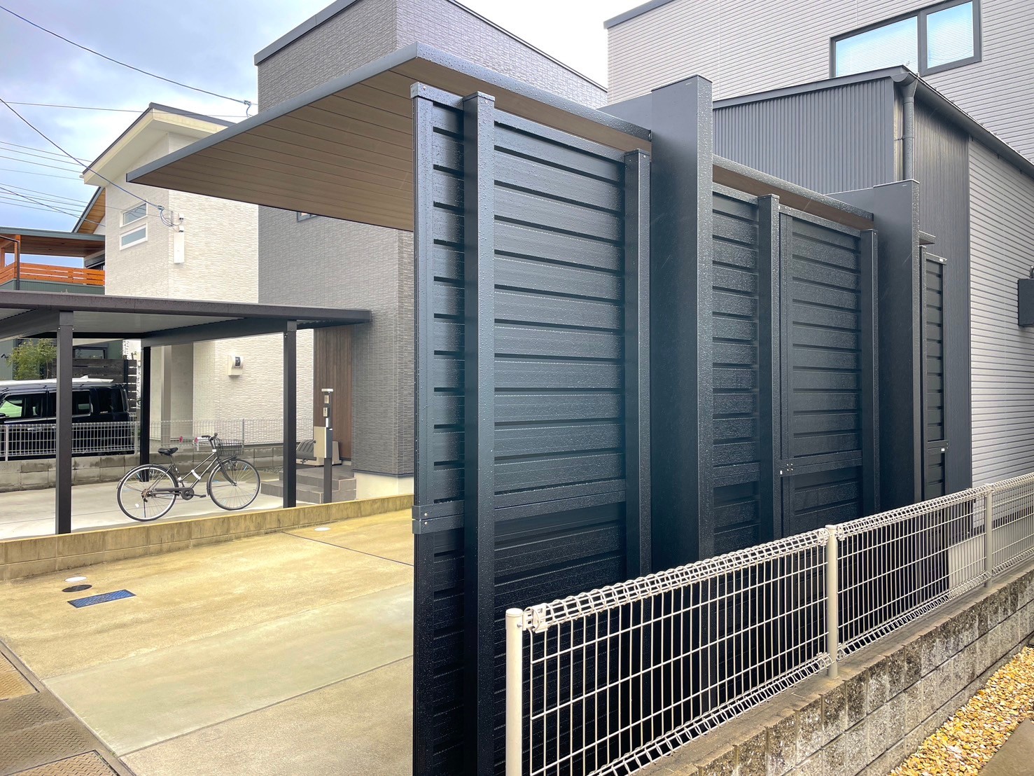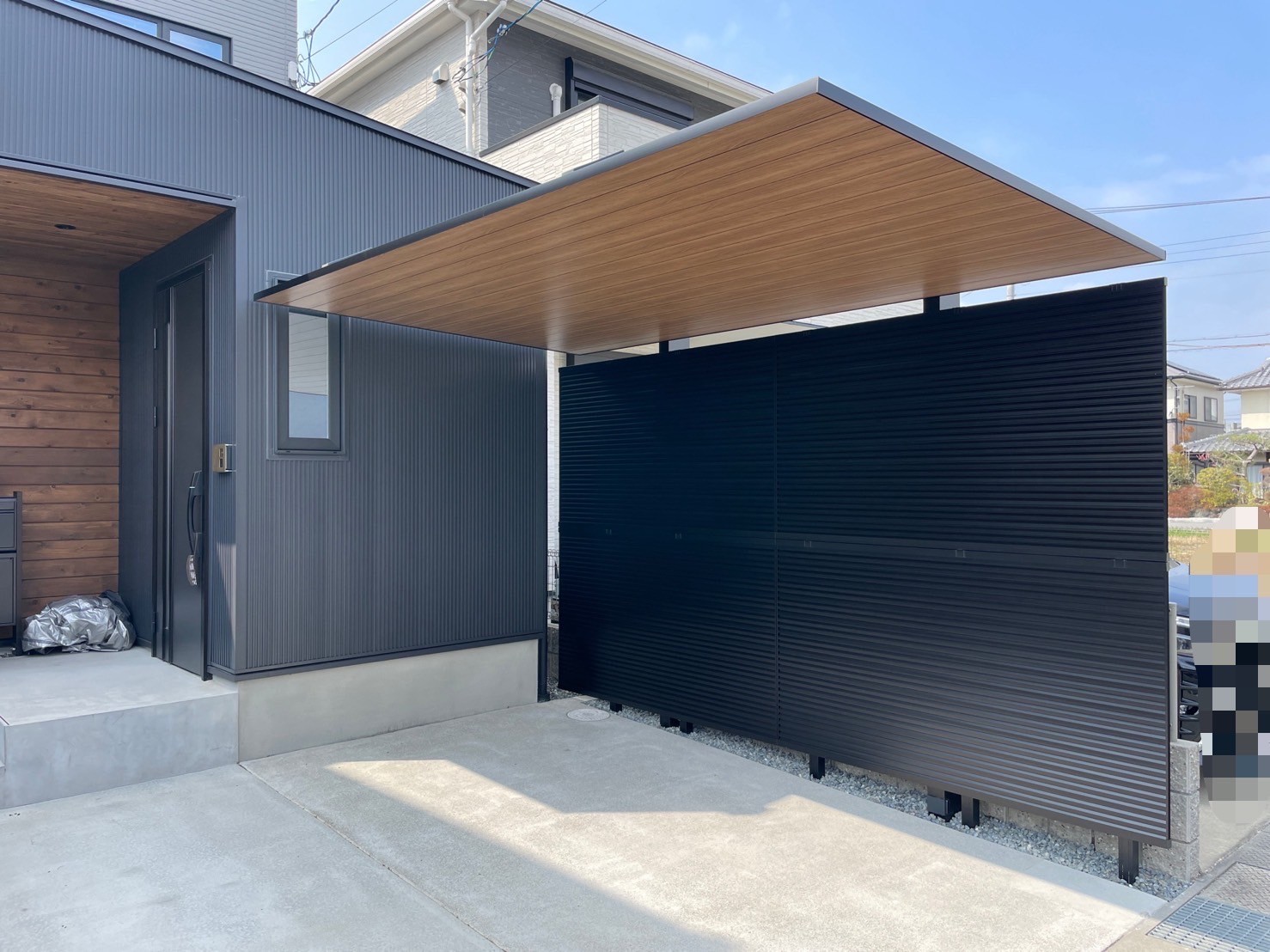 こだわりのウッド調で玄関のアクセントとの調和もとれ、目隠しフェンスでさらに空間に一体感をもたせました。 【使用商品】 ①LIXILカーポート カーポートsc 柱=ブラック 屋根=チェリーウッド ②LIXIL 目隠しフェンス フェンスAB YM1型 多段支柱 ブラック 価格=100万以下