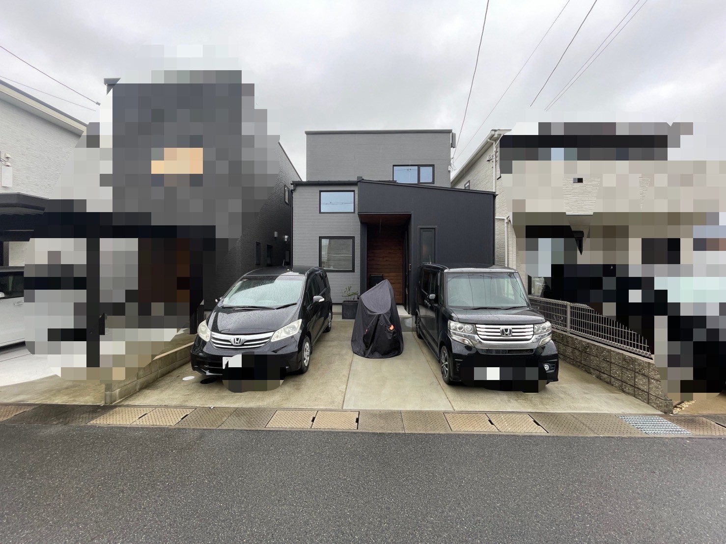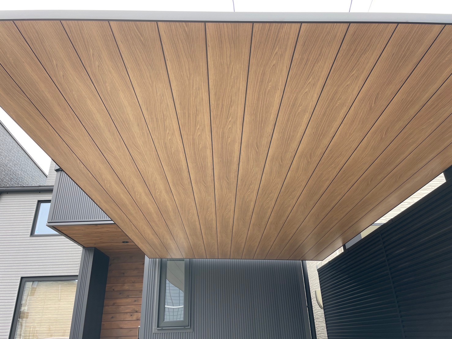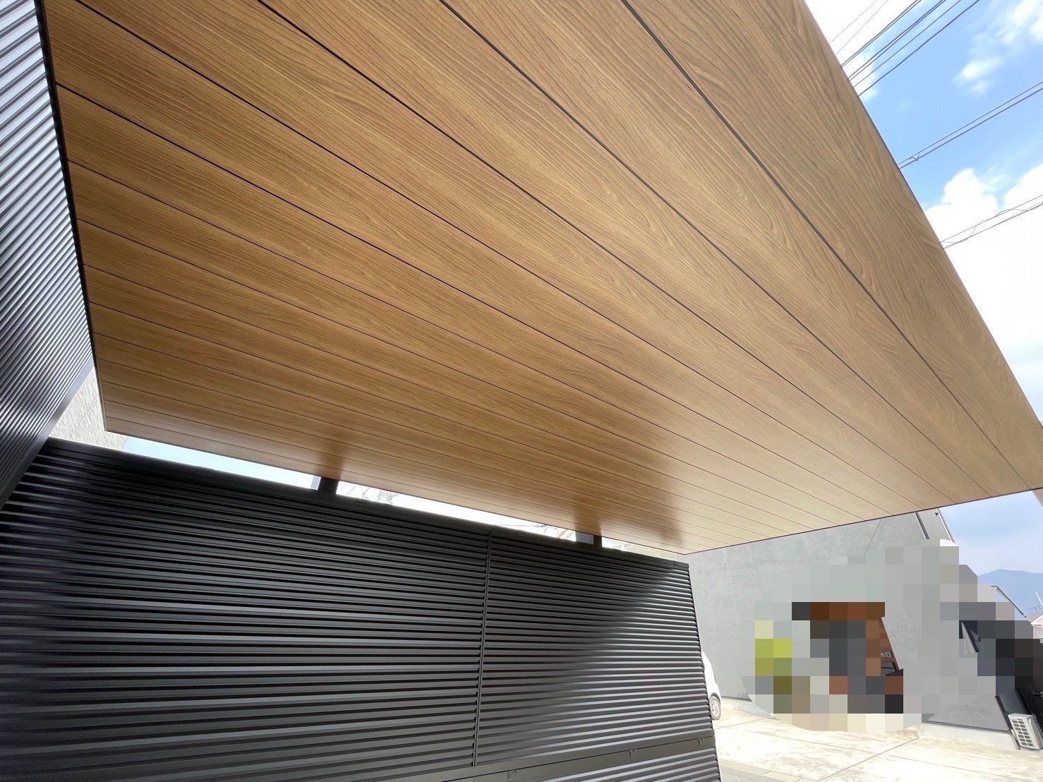 こだわりのウッド調で玄関のアクセントとの調和もとれ、目隠しフェンスでさらに空間に一体感をもたせました。 【使用商品】 ①LIXILカーポート カーポートsc 柱=ブラック 屋根=チェリーウッド ②LIXIL 目隠しフェンス フェンスAB YM1型 多段支柱 ブラック 価格=100万以下