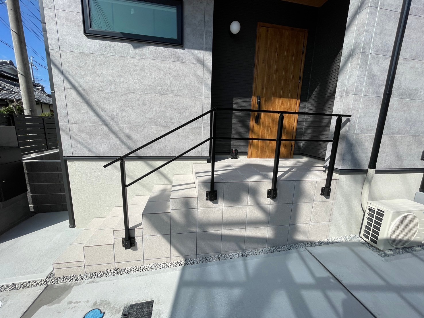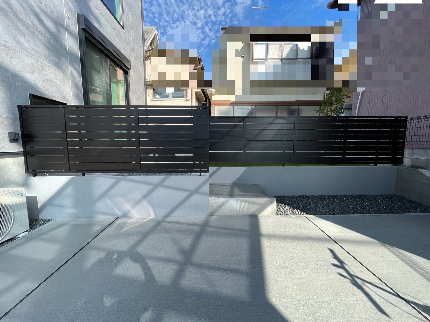 造作門柱はタイル張り 宅配ポストを使用し生活に便利なアイテムを取り入れながら目隠しにスタイリッシュな横スリットのフェンスで視線を適度に遮り、プライベートな空間を生み出しました。