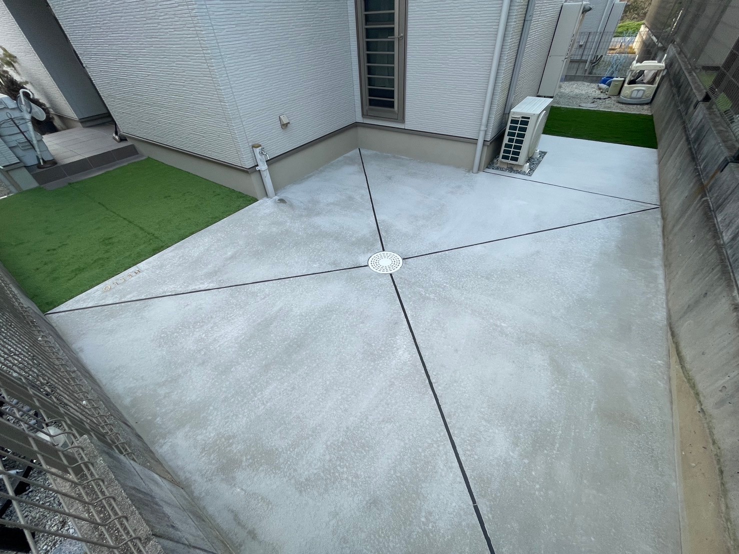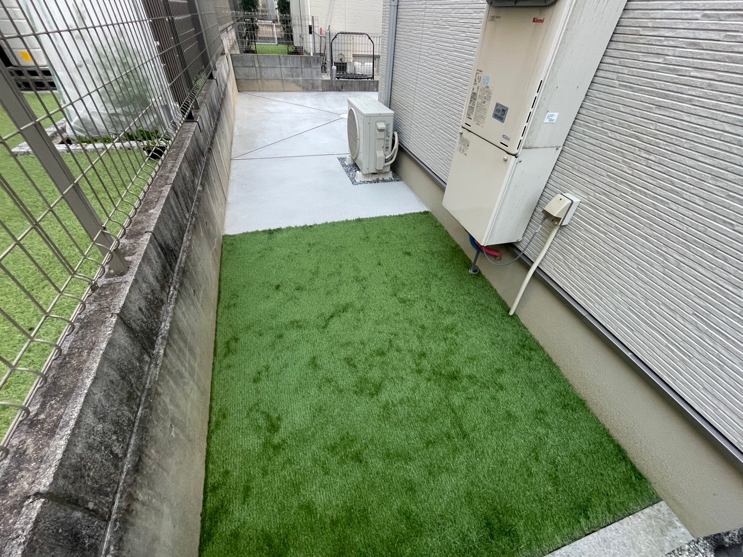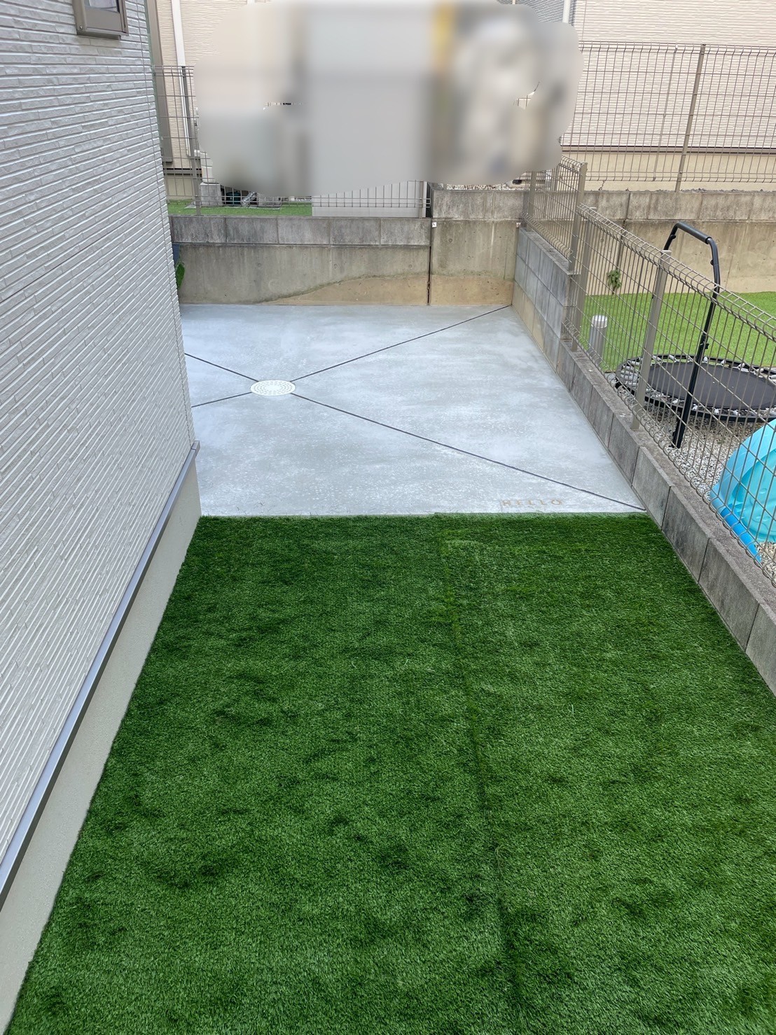 中庭の水捌けの悪さをコンクリート土間を打設し、排水パイプを仕込んで解消しました。 建物廻りは人工芝でスッキリ!