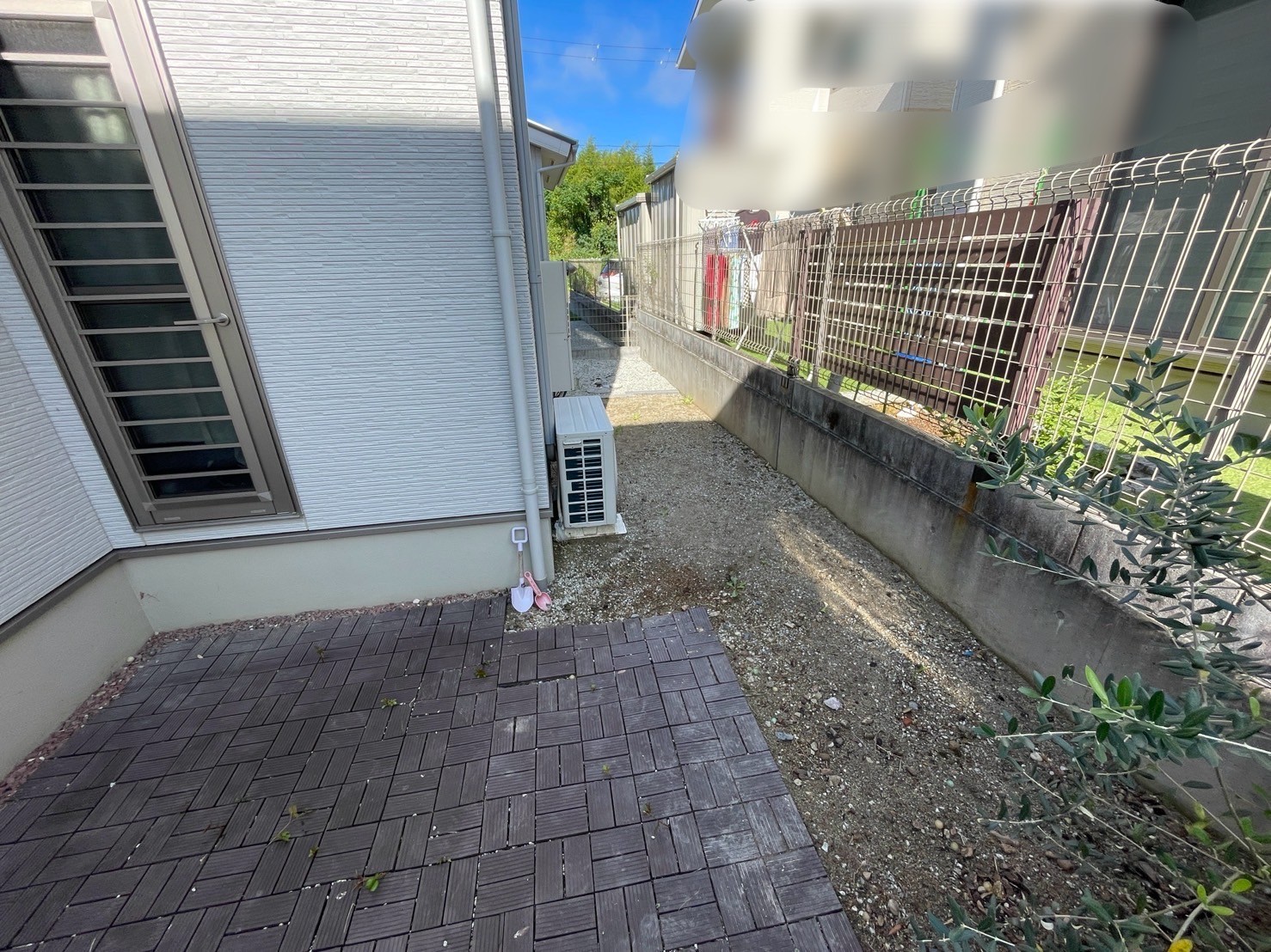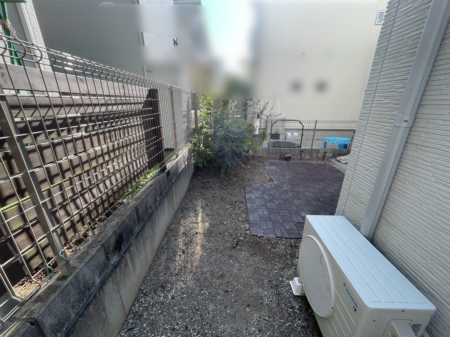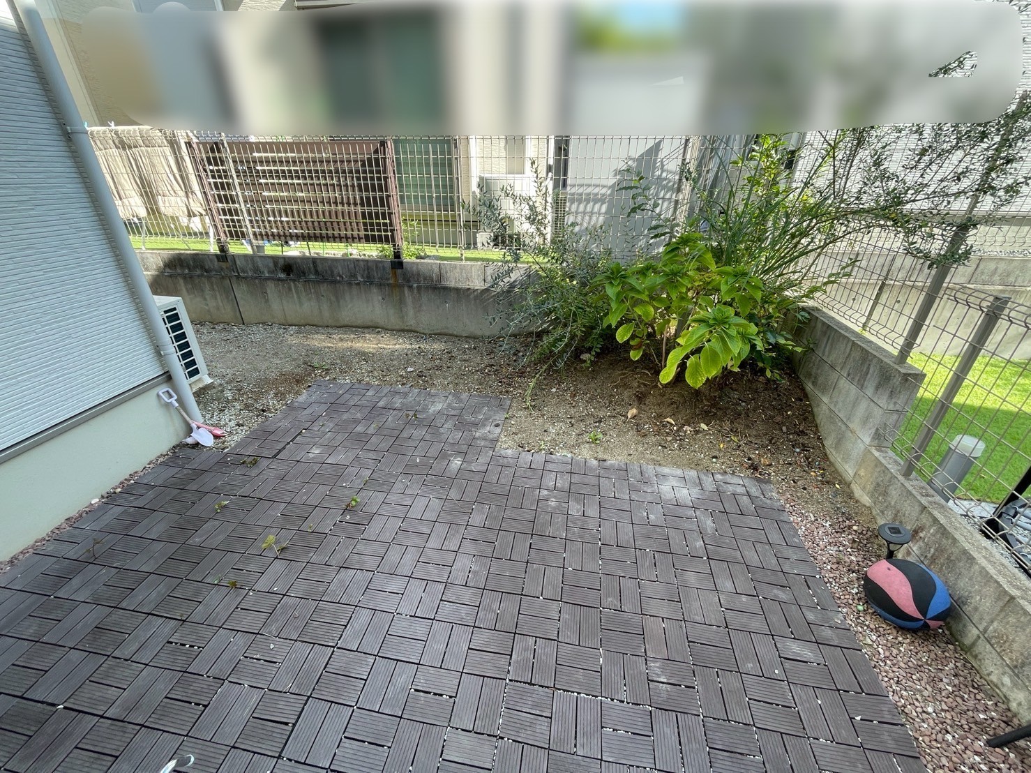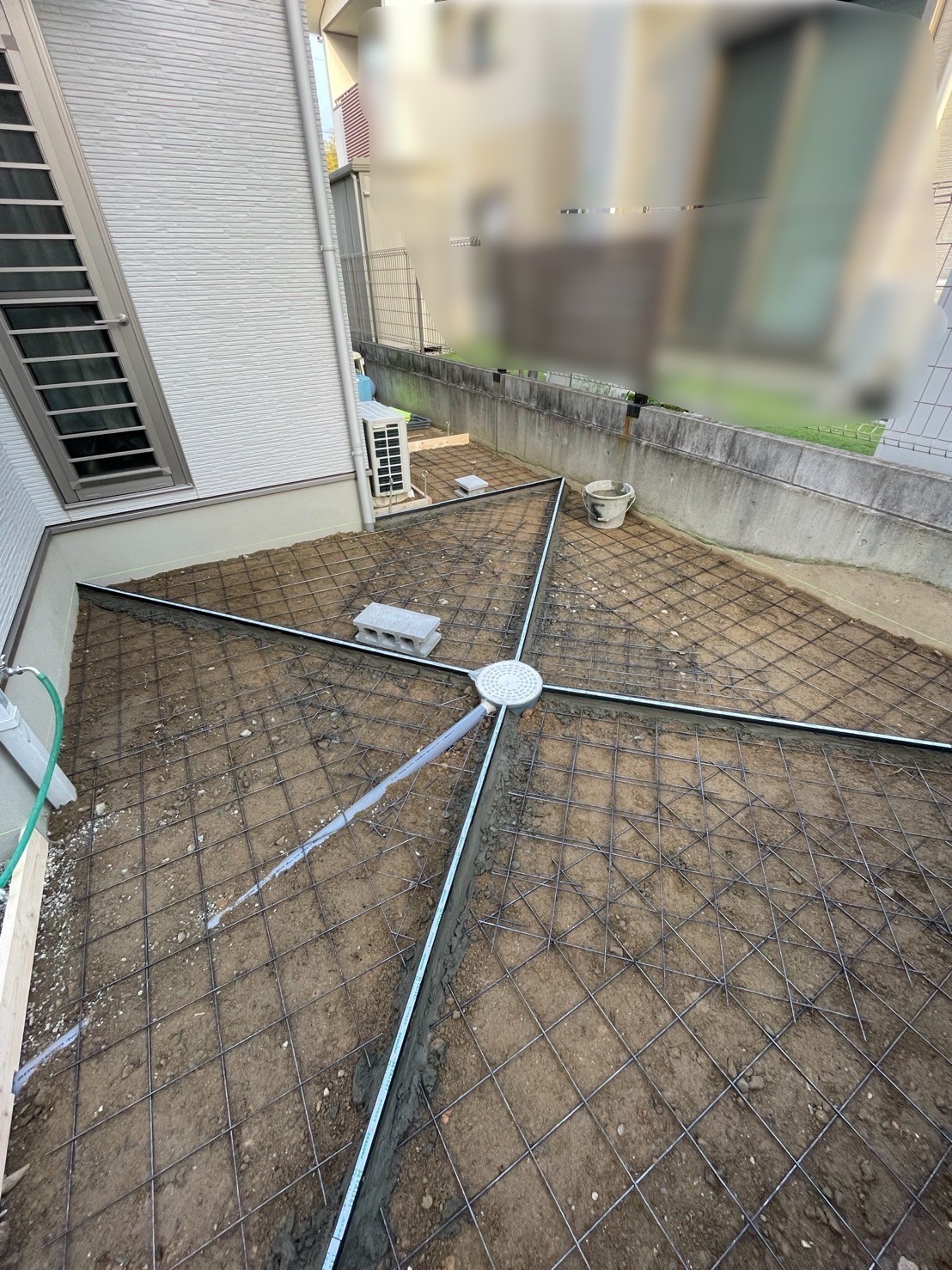 中庭の水捌けの悪さをコンクリート土間を打設し、排水パイプを仕込んで解消しました。 建物廻りは人工芝でスッキリ!