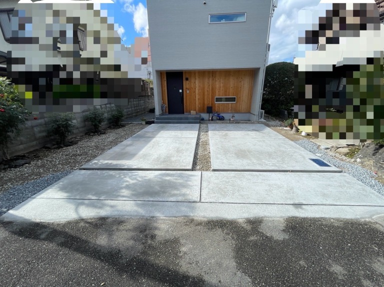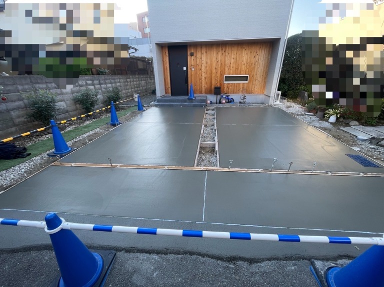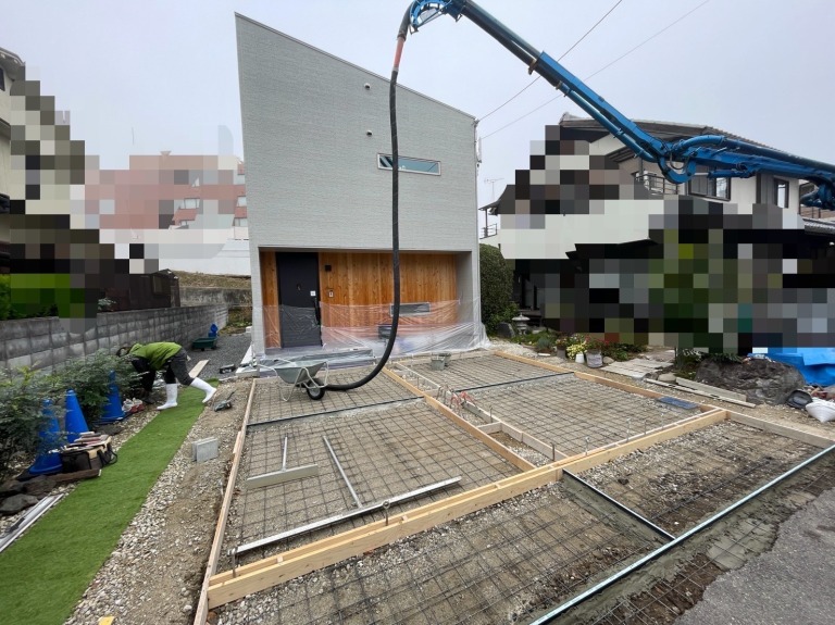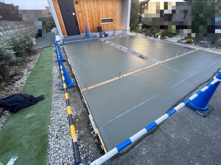 新築外構工事ですが、お客様が人工芝やお庭をDIYされます。 土間コンクリート工事は出来ないのでとのご依頼を頂きましてお手伝いさせて頂きました。