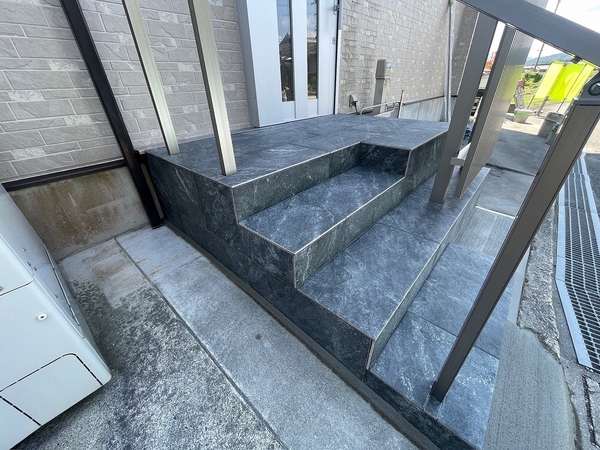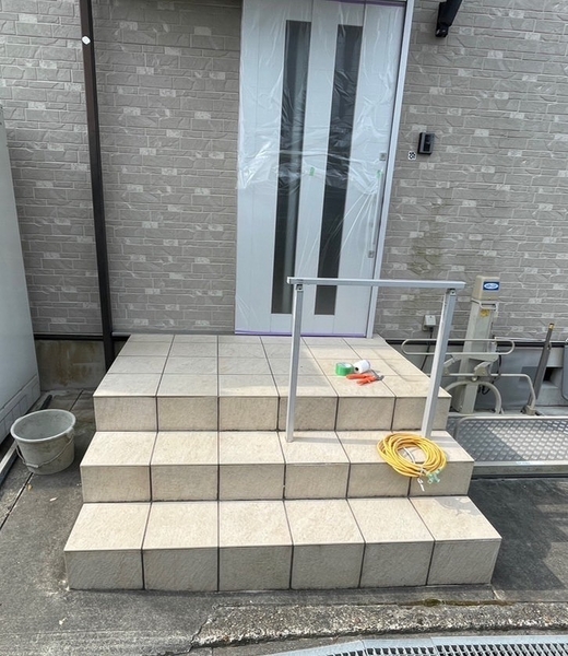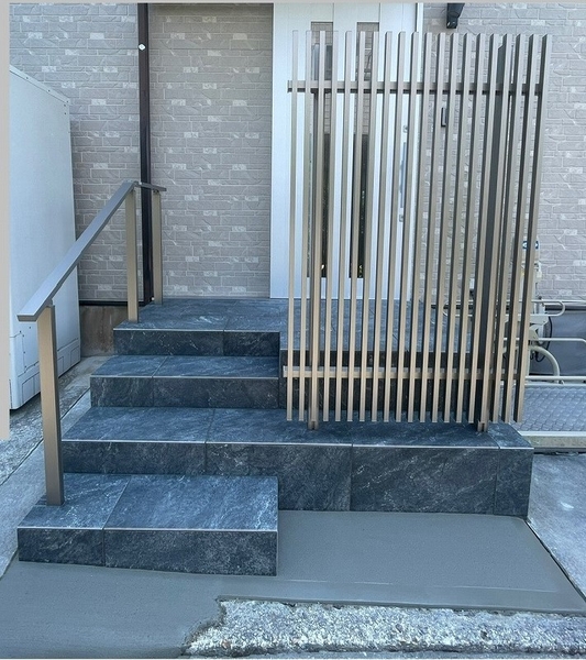 段差解消で不便だった玄関アプローチが大変身!手すりを付けて安心感を、段差解消した階段と大きなフェンスで快適性とデザイン性を両立しました。 毎日が笑顔になる、スタイリッシュで安全なエントランスの完成です!